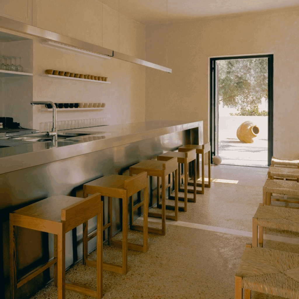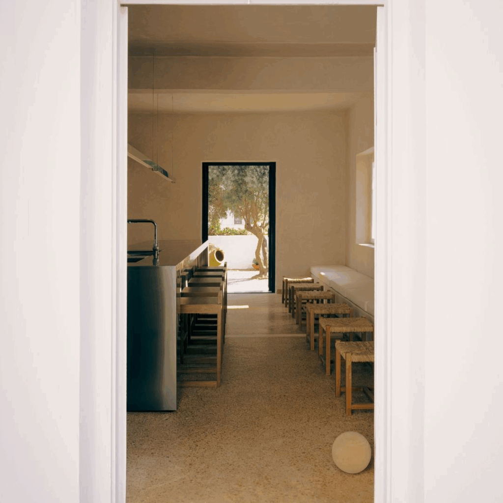 Em vez de imitar a linguagem familiar do minimalismo das Cíclades, o interior funciona em registros mais silenciosos.