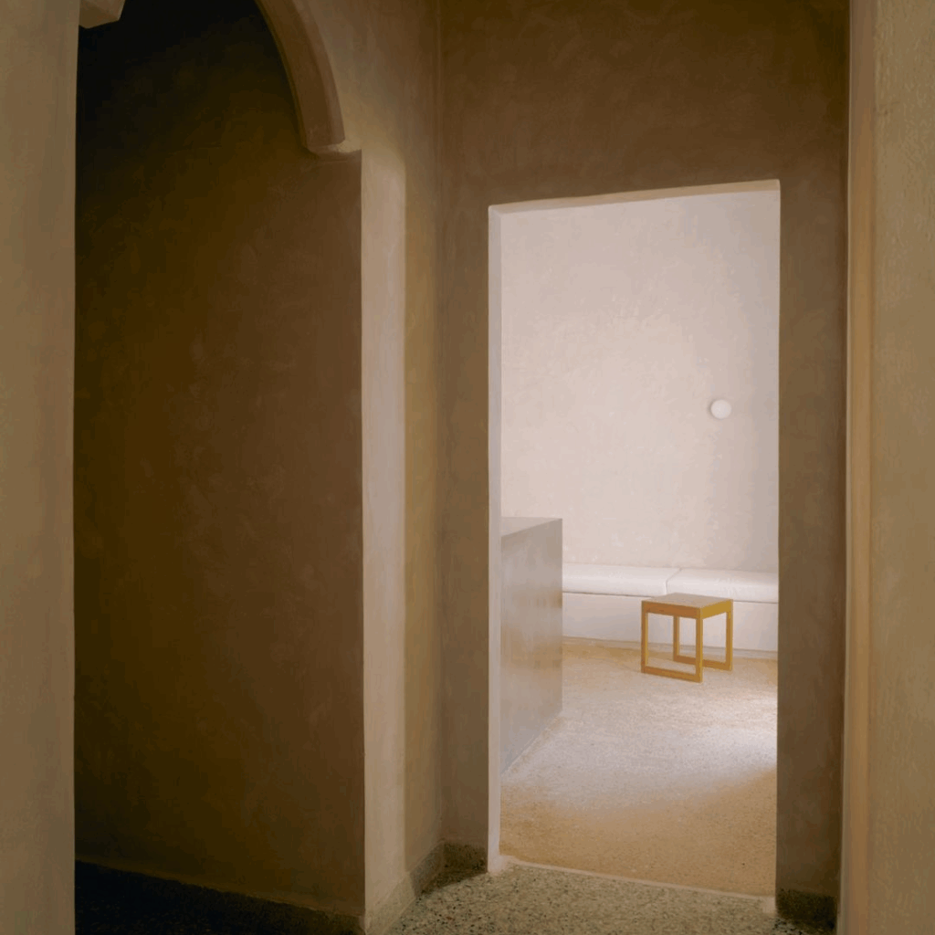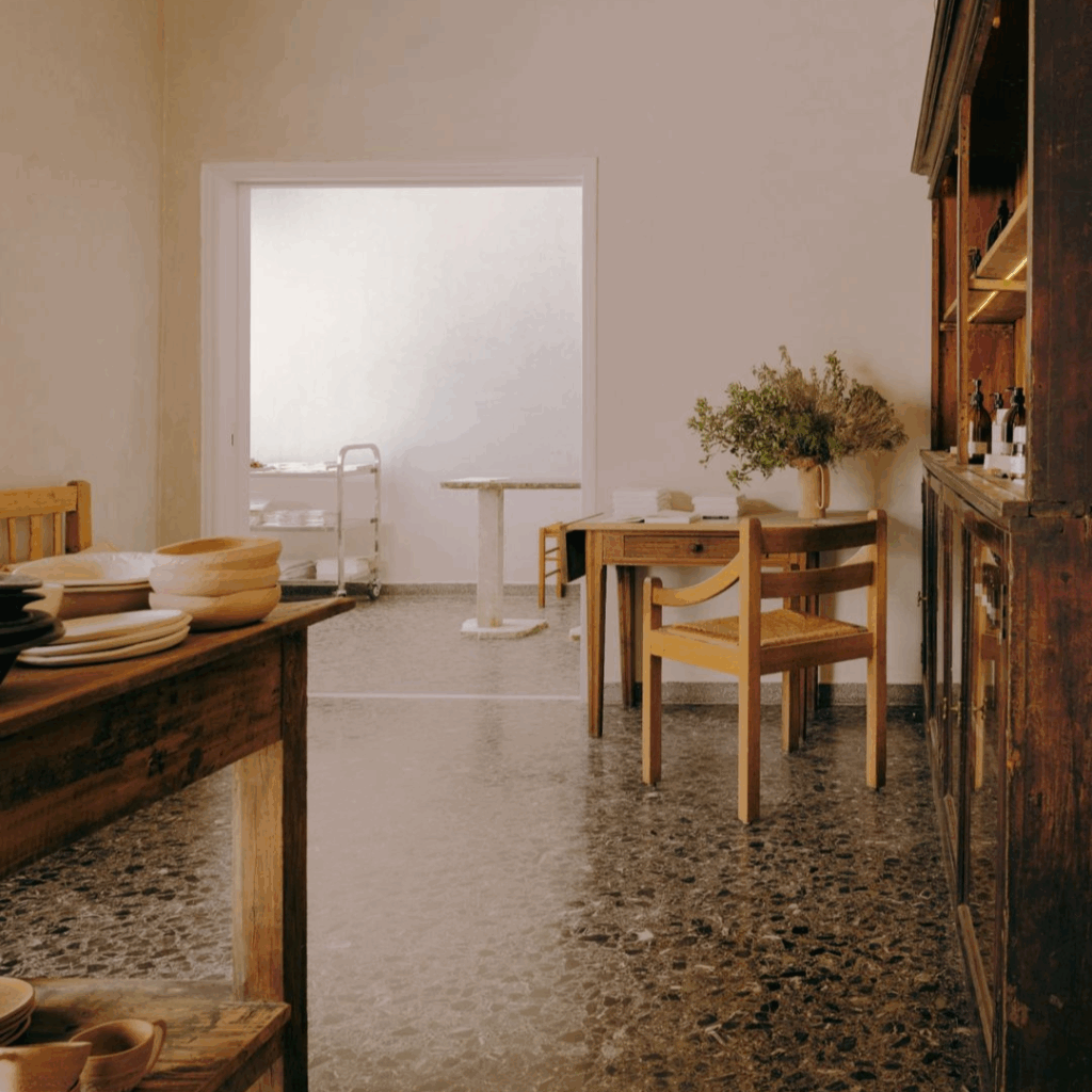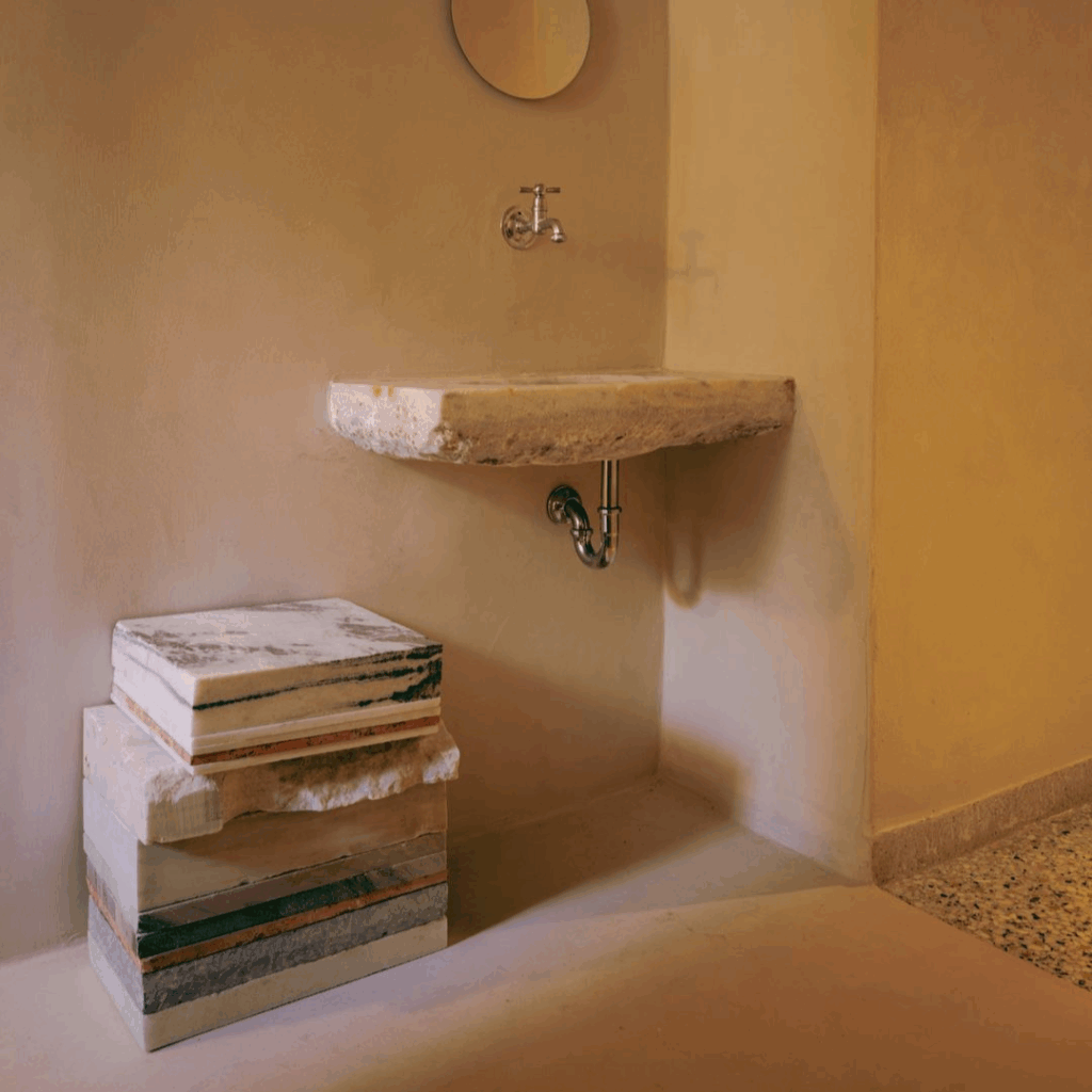 Materiais locais, superfícies lavadas com cal, cerâmica artesanal, madeira quente, criam um cenário calmo para gestos cotidianos.
