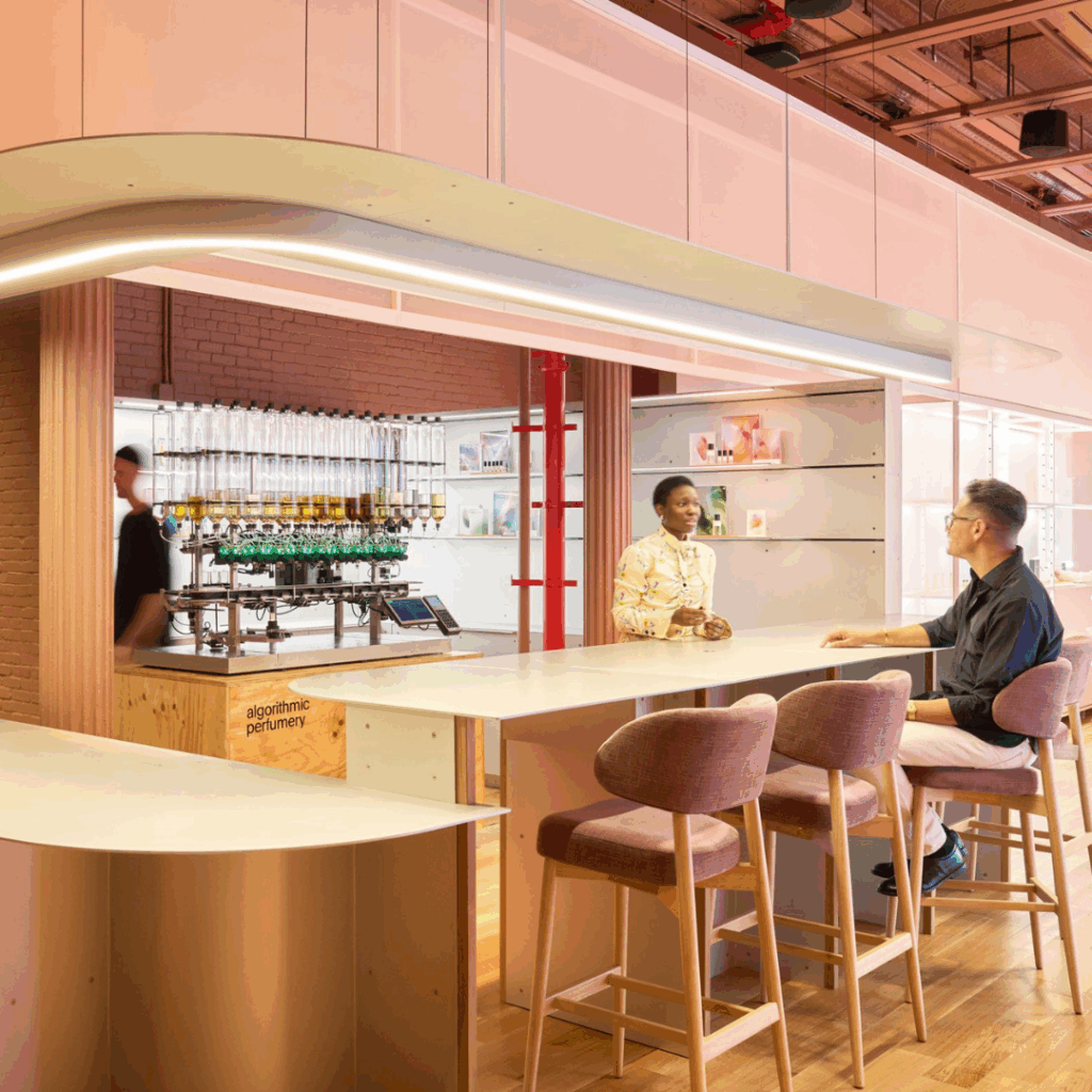 Um Maker Bar permite que os visitantes personalizem suas compras ou participem de workshops interativos, enquanto mais atrás, mais balcões e mesas de bar oferecem espaços para conversas.