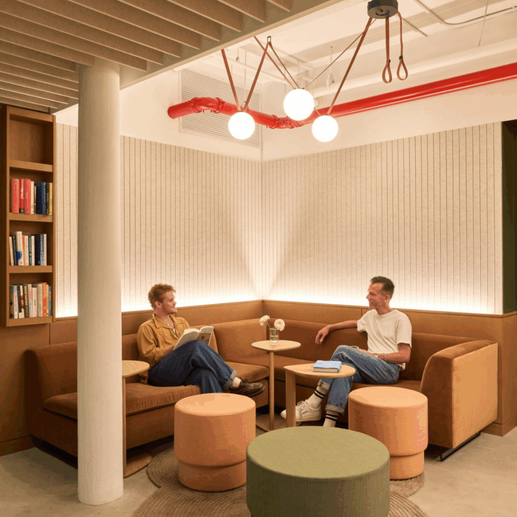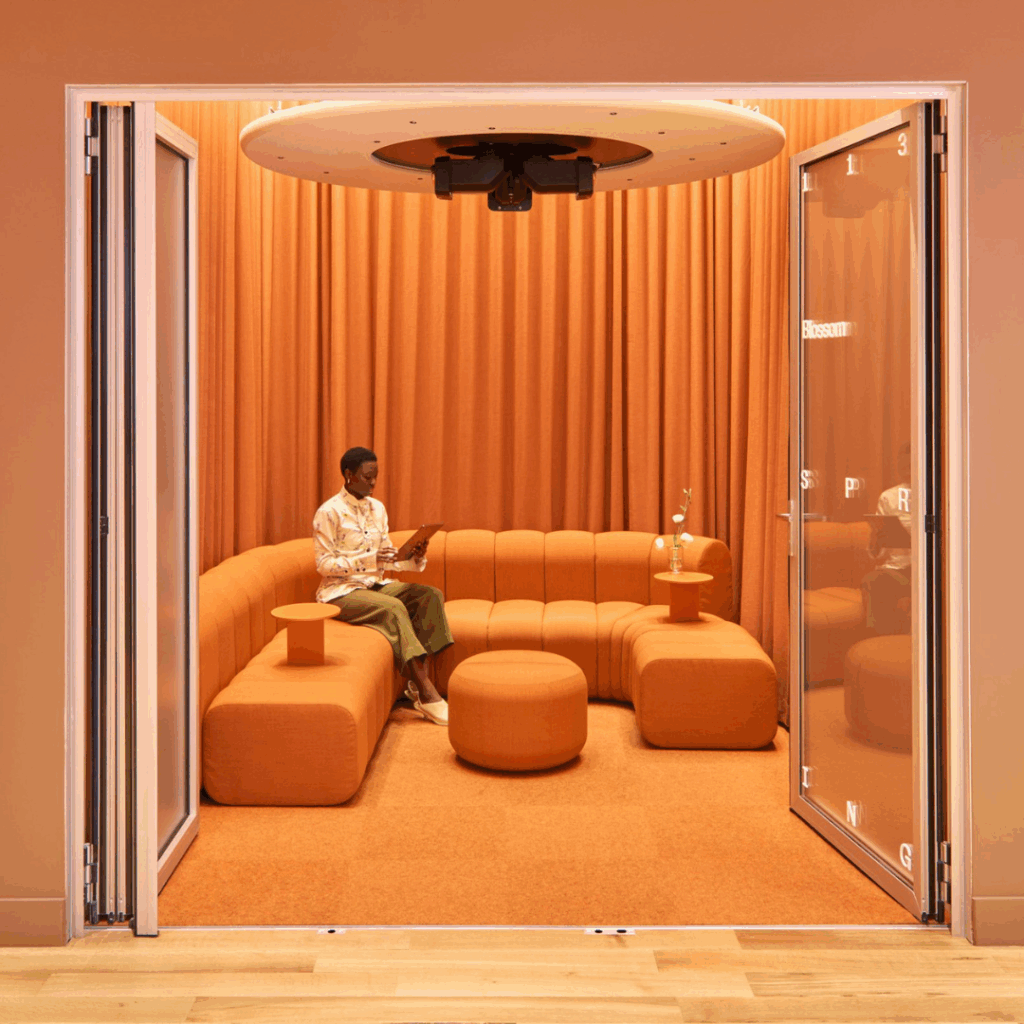 Em frente, um par de salas de consultoria são totalmente encharcadas em uma única cor, amarelo em uma e laranja na outra, enquanto outros espaços de reunião também são codificados por cores.