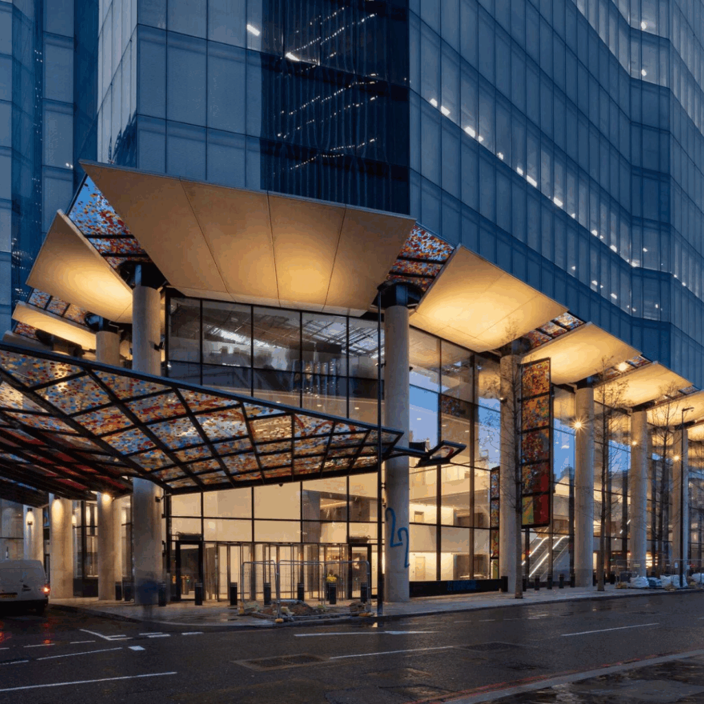 Moldada para respeitar as vistas da paisagem urbana, sua forma de vidro facetado de vinte e três lados cria um pano de fundo forte e sereno para as torres articuladas circundantes e para o tecido histórico da Área de Conservação do Banco da Inglaterra.