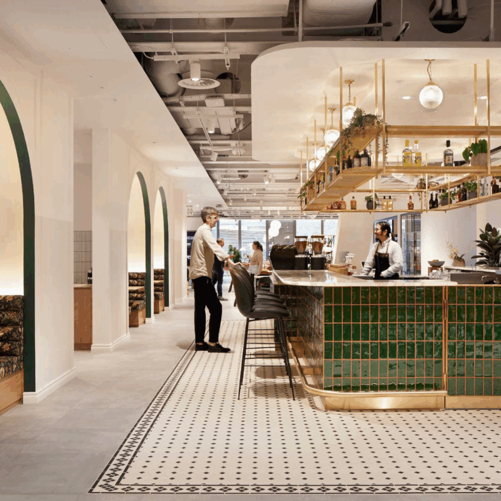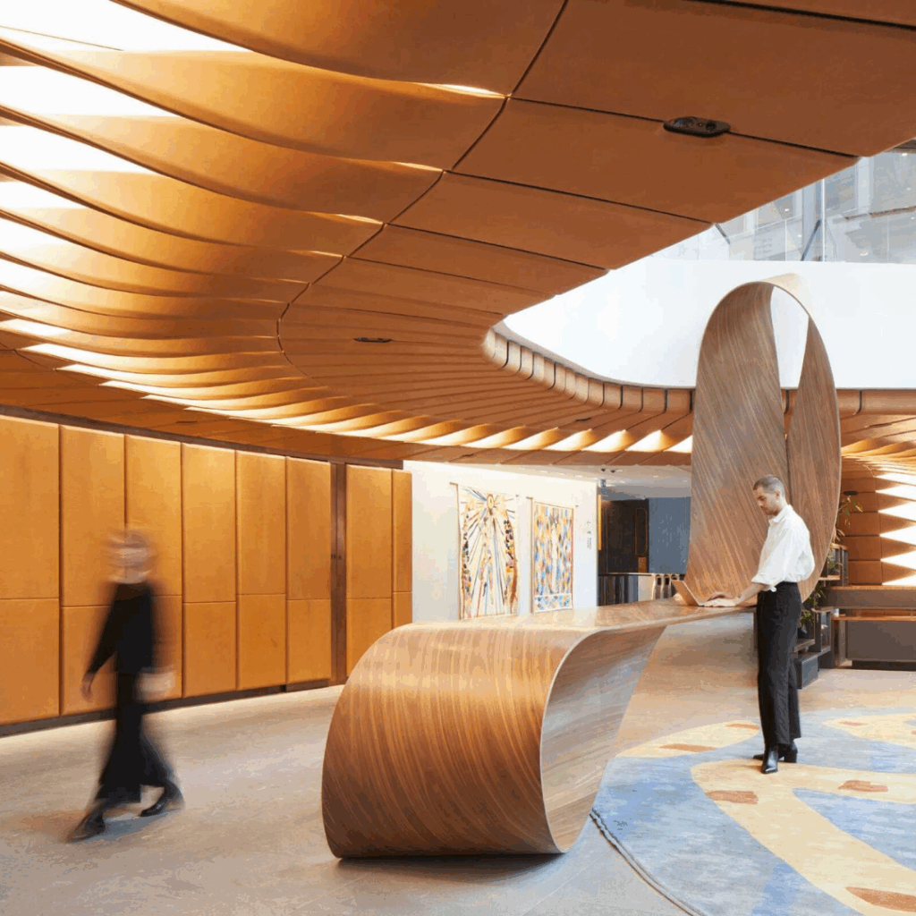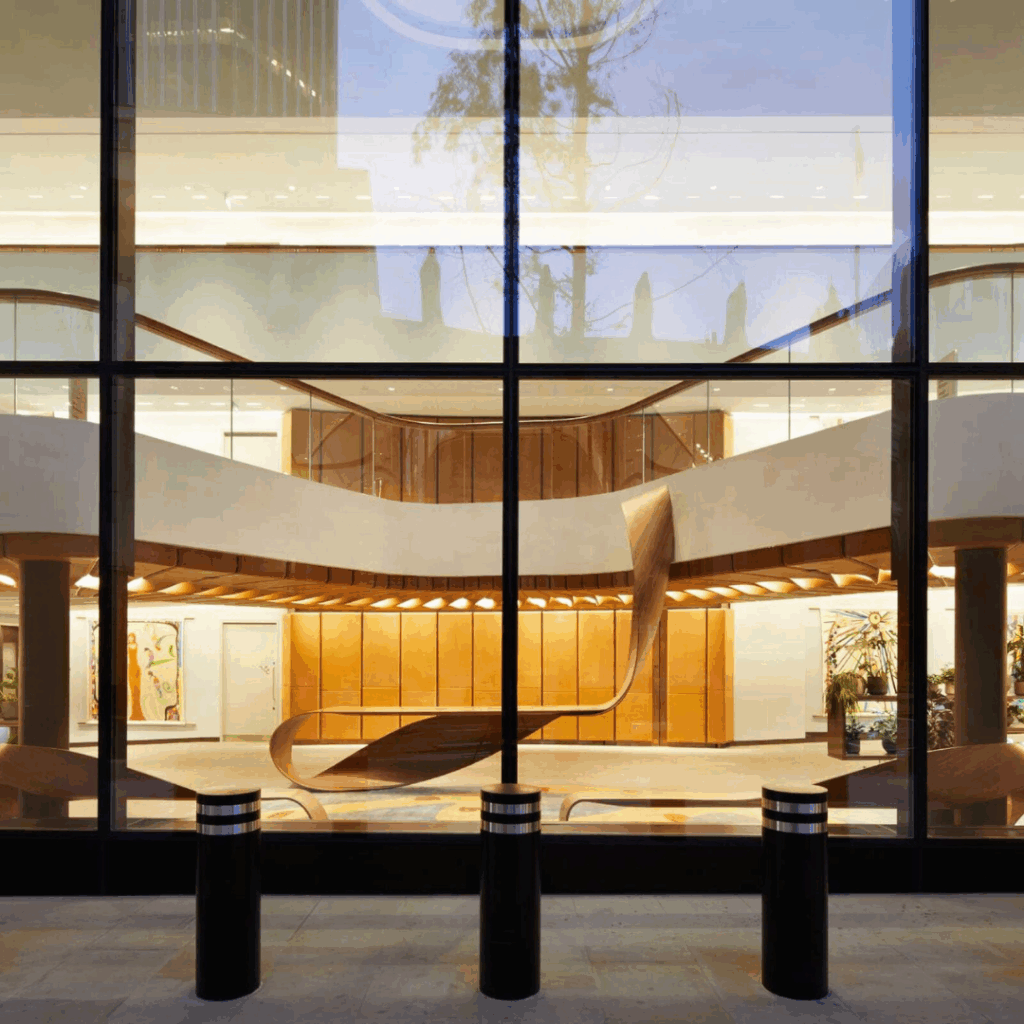 Instalações permanentes adornam o edifício, como as coberturas de vidro de Alexander Beleschenko e a ‘biblioteca’ de recepção de couro artesanal de Bill Amberg.