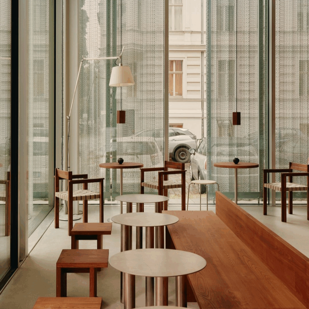 Em direção à fachada, os elementos de assento, um grande banco, bancos castanhos e mesas de aço mínimas, interagem sutilmente com as matérias-primas do envelope.
