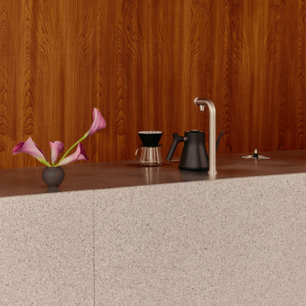 Em contraste, um balcão monolítico em aço inoxidável e granito abriga o serviço de café e pastelaria, sua paleta suave ecoando o ambiente de concreto e permitindo que a madeira e os detalhes selecionados tenham precedência visual.