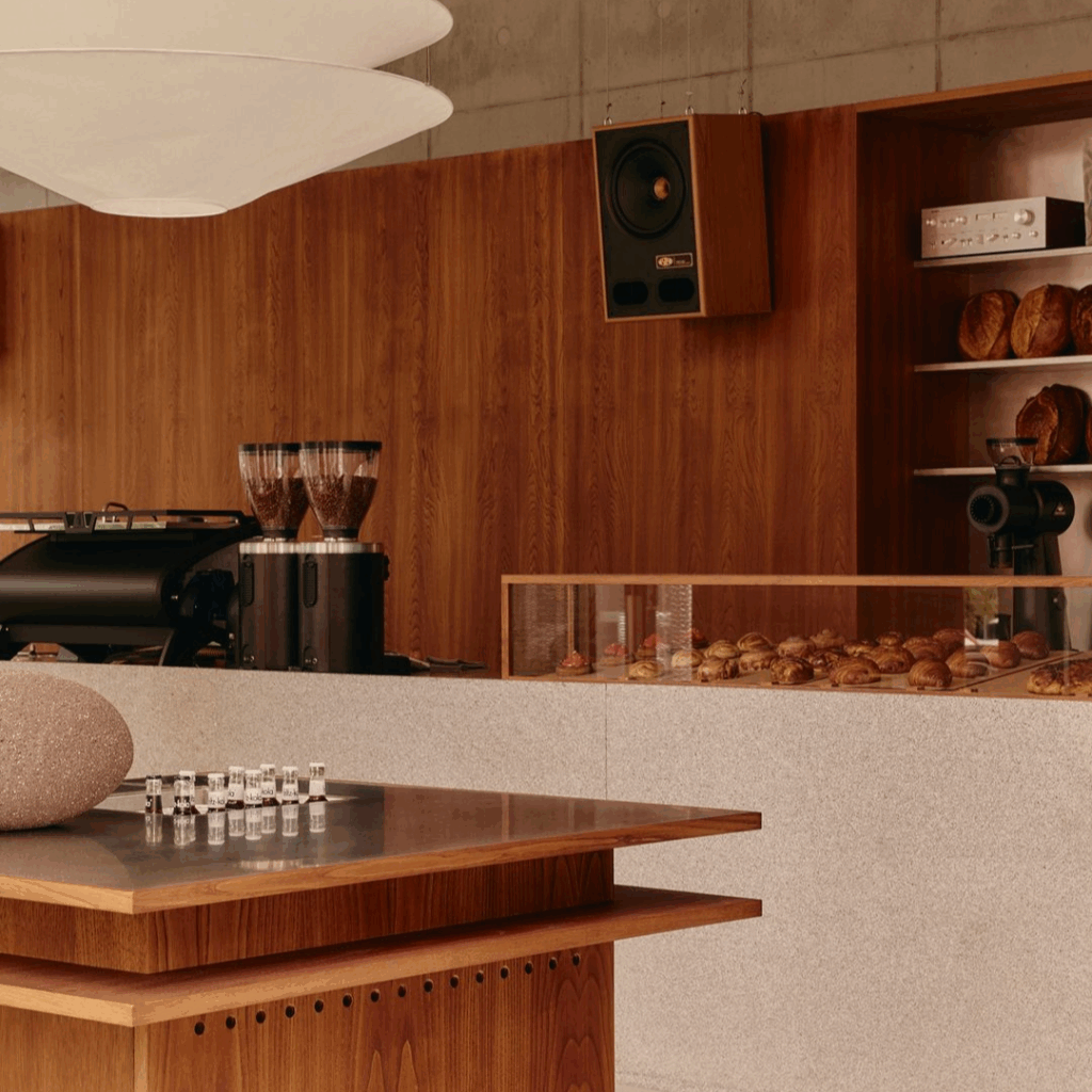 No centro do projeto está uma grande estrutura de madeira de castanheiro que envolve a escada para o porão, suporta prateleiras para pão e equipamentos e ancora um par de alto-falantes de madeira proeminentes que definem a atmosfera ambiente do café.