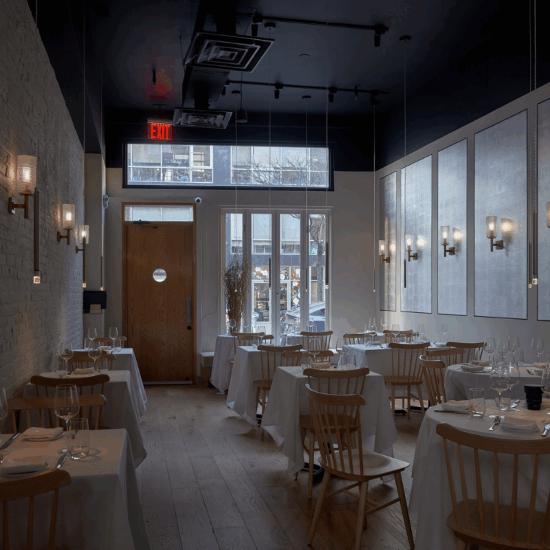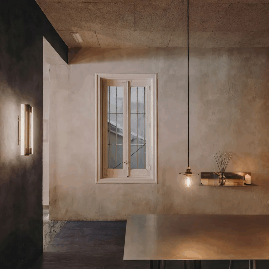 O salão se instala em uma calma monástica. Uma longa mesa de aço escovado ancora a sala, cercada por móveis reduzidos.