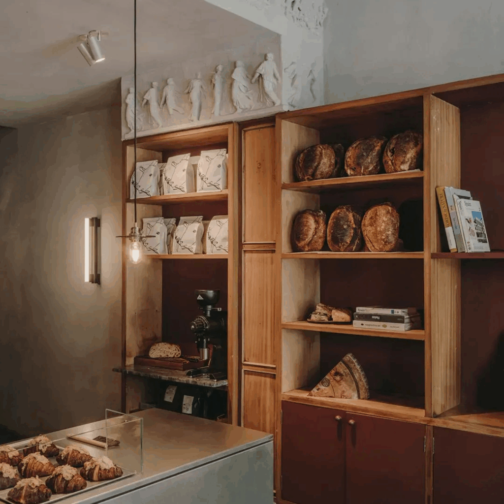 Pisos de parquet, prateleiras de madeira e frisos de gesso lembram uma era mais lenta, agora animada pelo cheiro de café e pão.