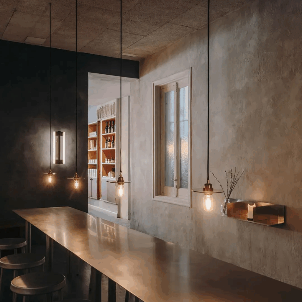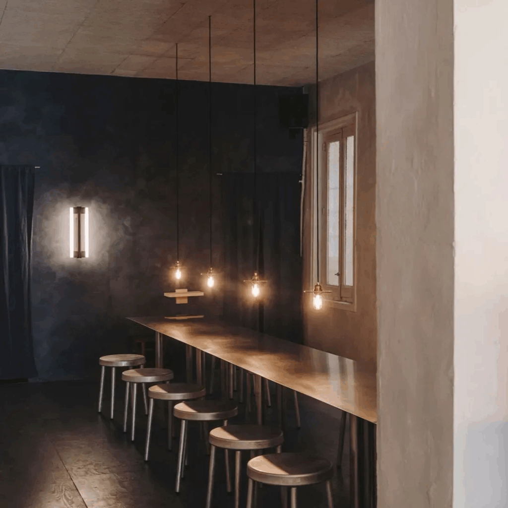 Pisos de compensado pintados de azul e lâmpadas nuas trazem uma quietude fria e reflexiva, um contraponto suave à rua do lado de fora.
