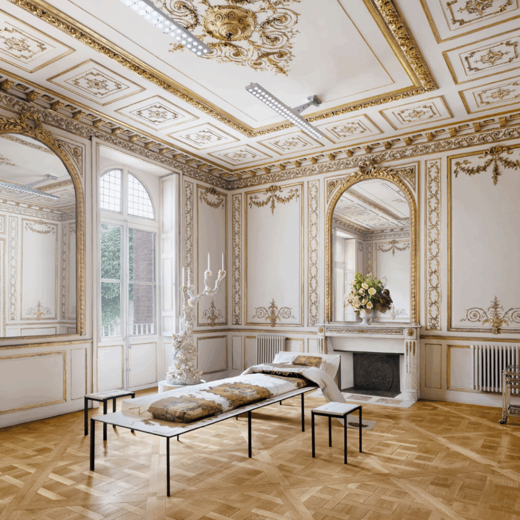 Caminhe pelo hôtel particulier restaurado e você encontrará molduras pintadas de ouro e pisos em parquet que foram trazidos de volta à vida.