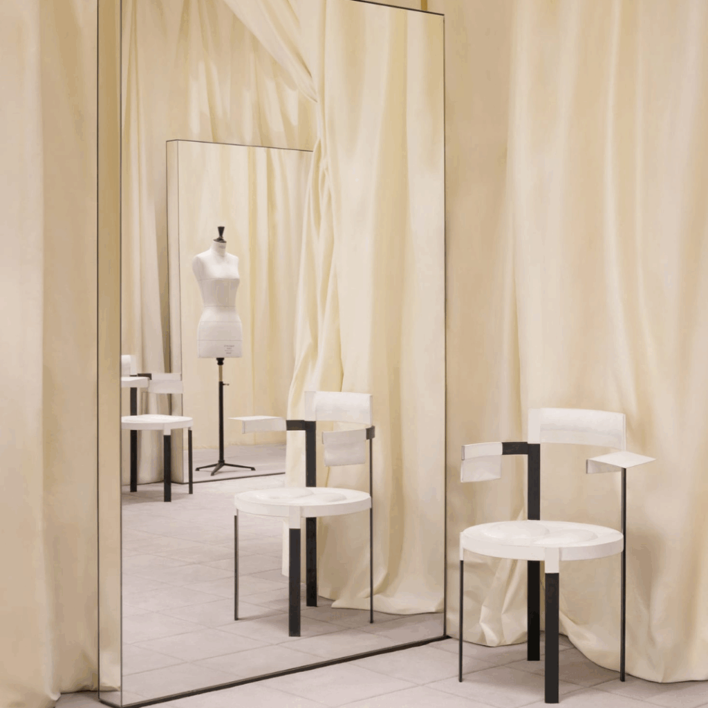 Um provador VIP possui cortinas do chão ao teto e assentos que ecoam a cenografia de Gschwandtner para o show SS24 da Acne Studios.