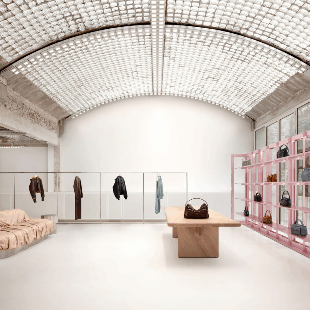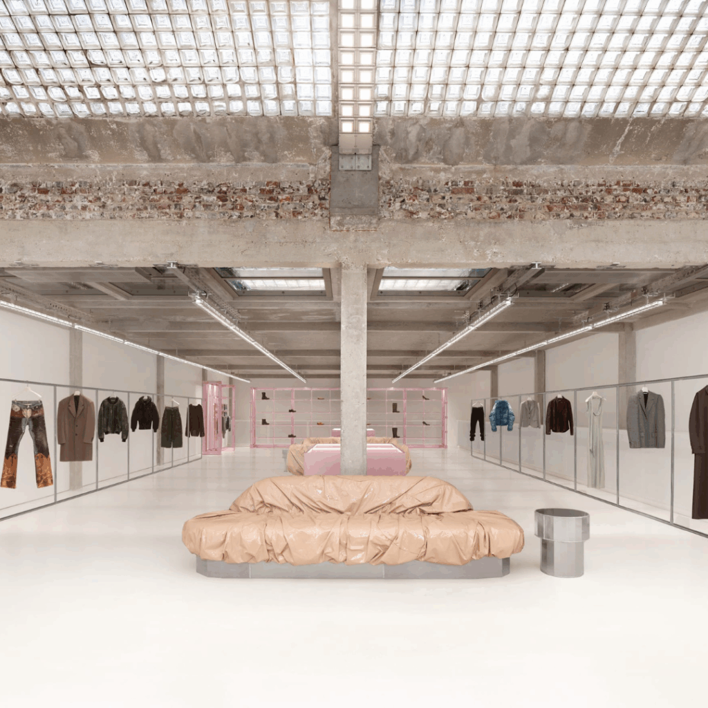 As estrelas do showroom são um par de enormes sofás Max Lamb cobertos com vinil rosa Acne Studios de alto brilho para aquele toque perfeito de feio legal.