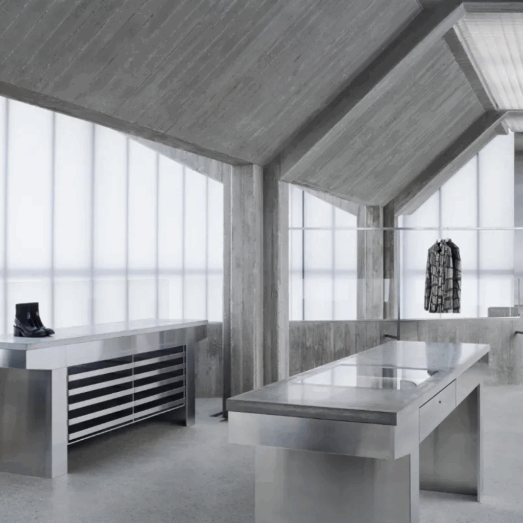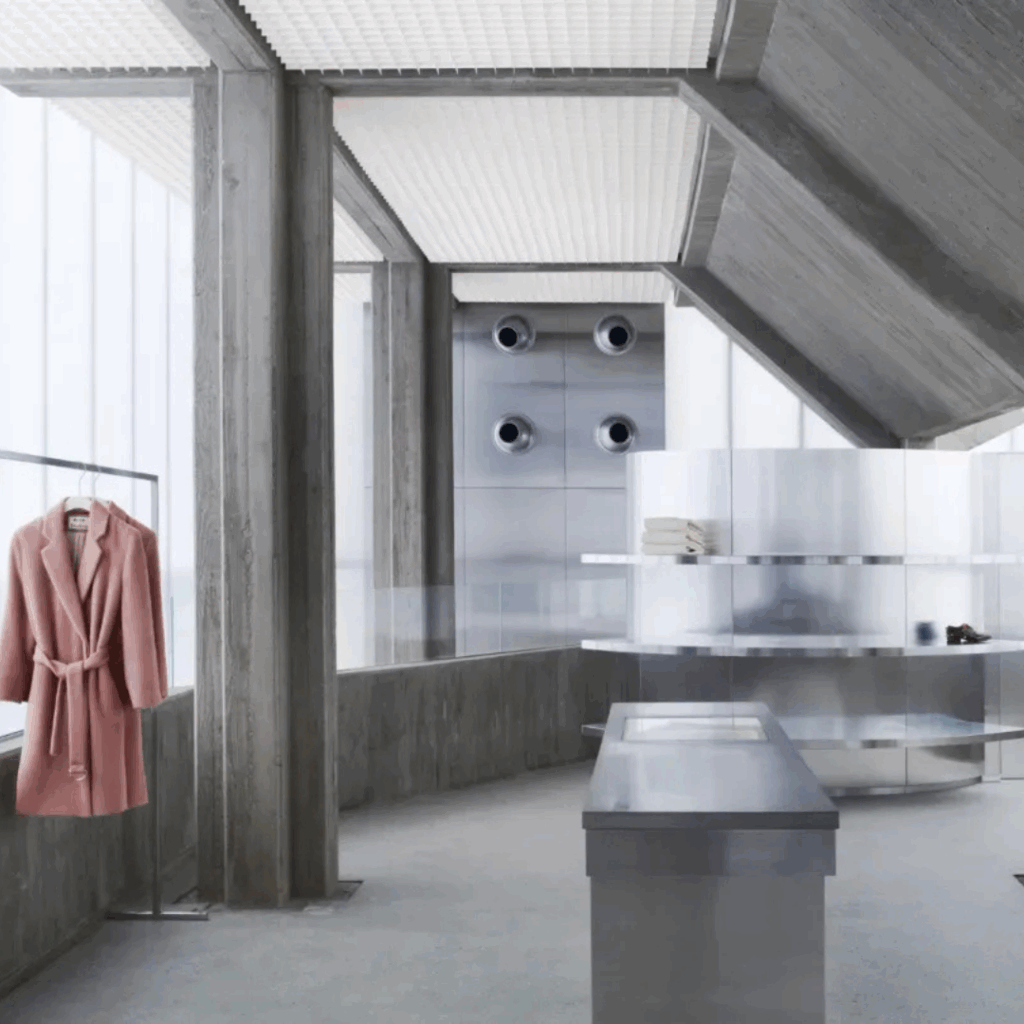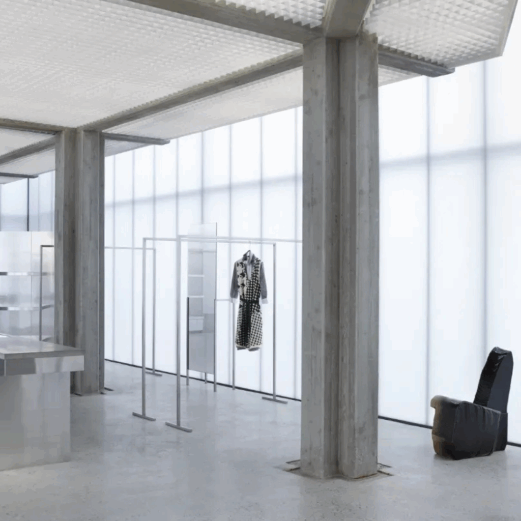 É um espaço de varejo que funciona como uma instalação, recusando-se a apenas hospedar roupas, mas criando um mundo para elas.
