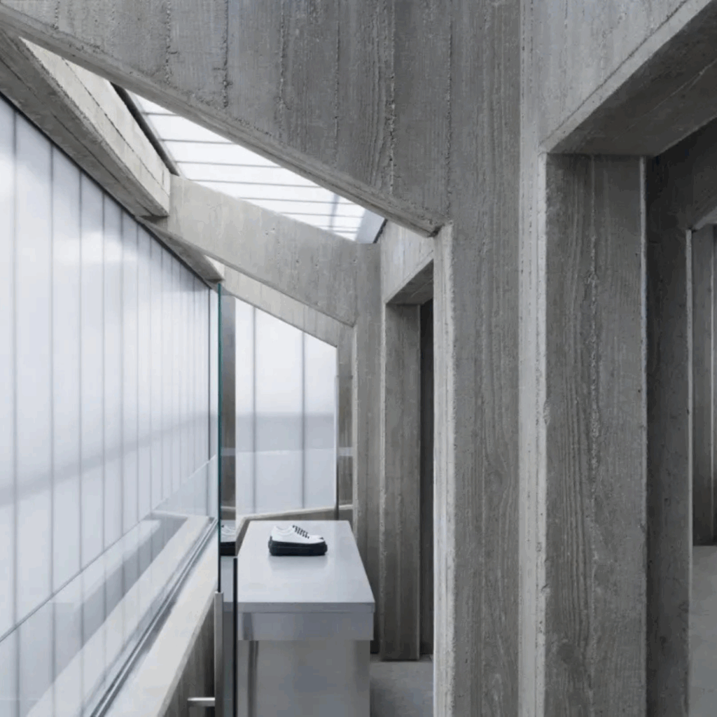 O interior é organizado em torno de uma estrutura de concreto bruto que parece quase escultural em sua massa.