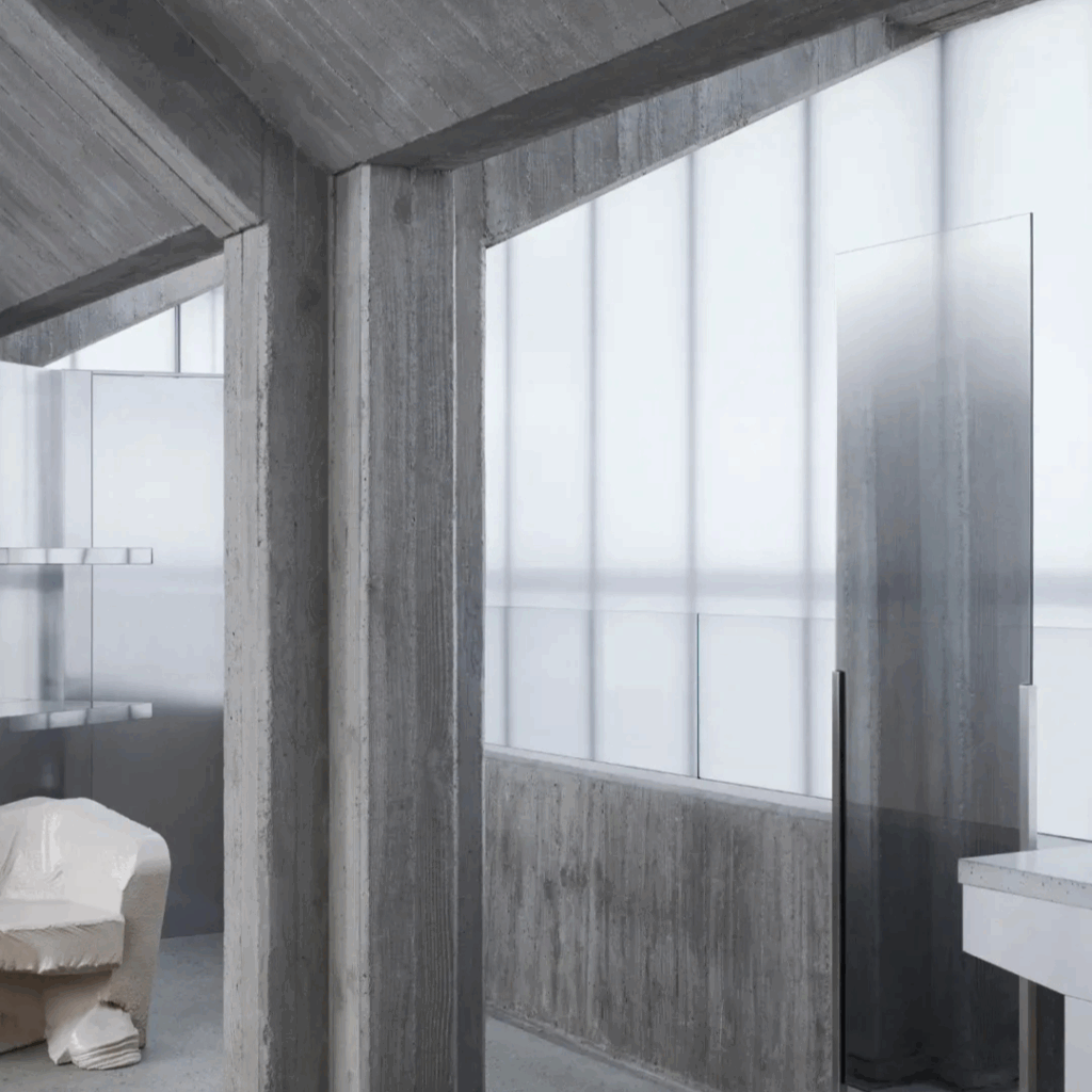 Os materiais são reduzidos ao seu mais elementar: concreto áspero impresso em madeira, painéis de metal suavemente reflexivos e vidro que difunde a luz em um crepúsculo perpétuo.