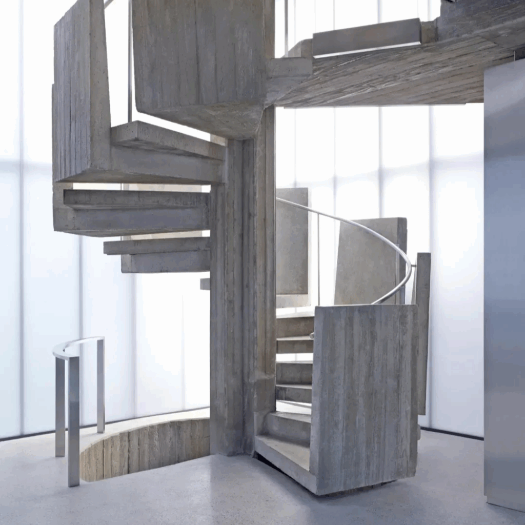 Quatro colunas grossas sustentam o nível superior, enquanto uma escada flutuante gira em torno de uma, exagerando a tensão entre peso e suspensão.