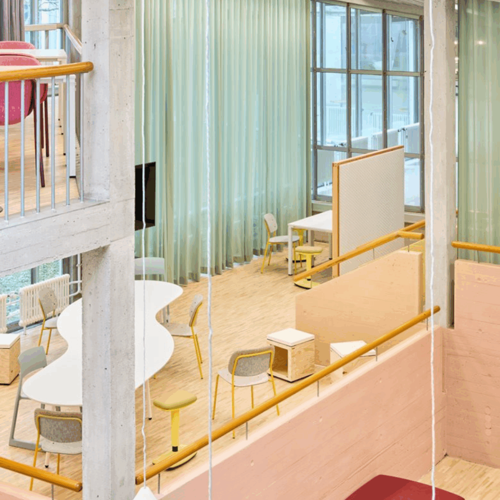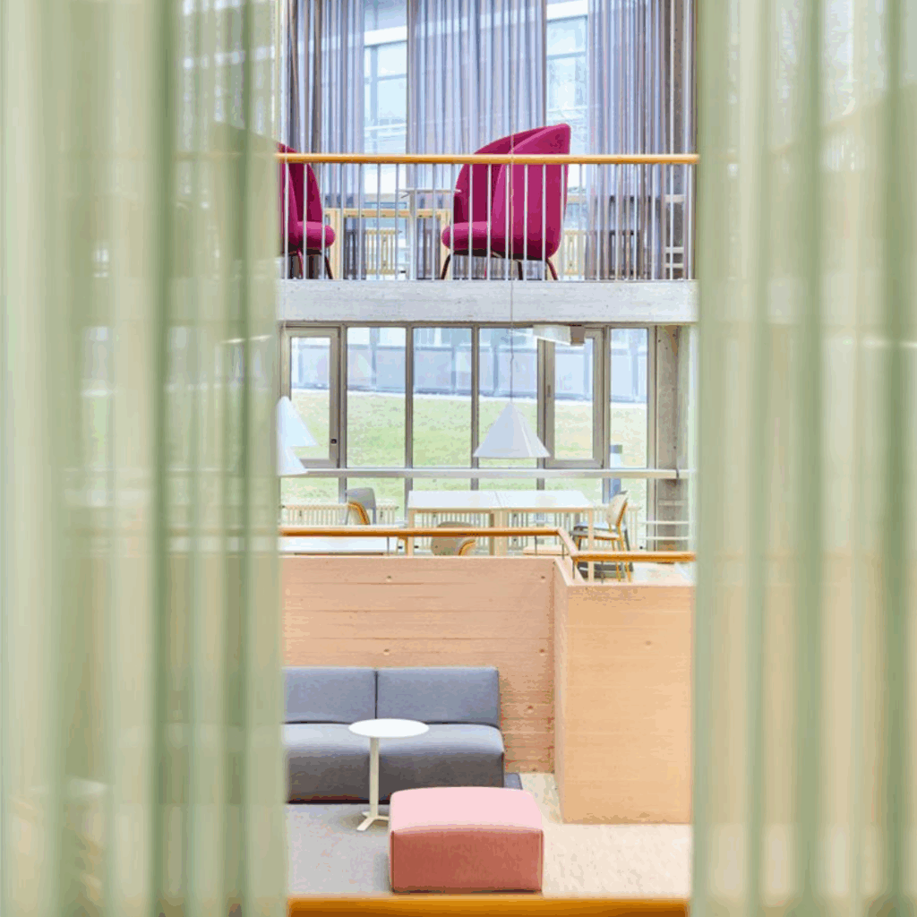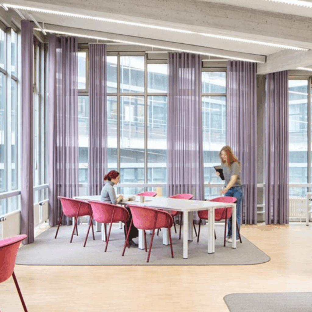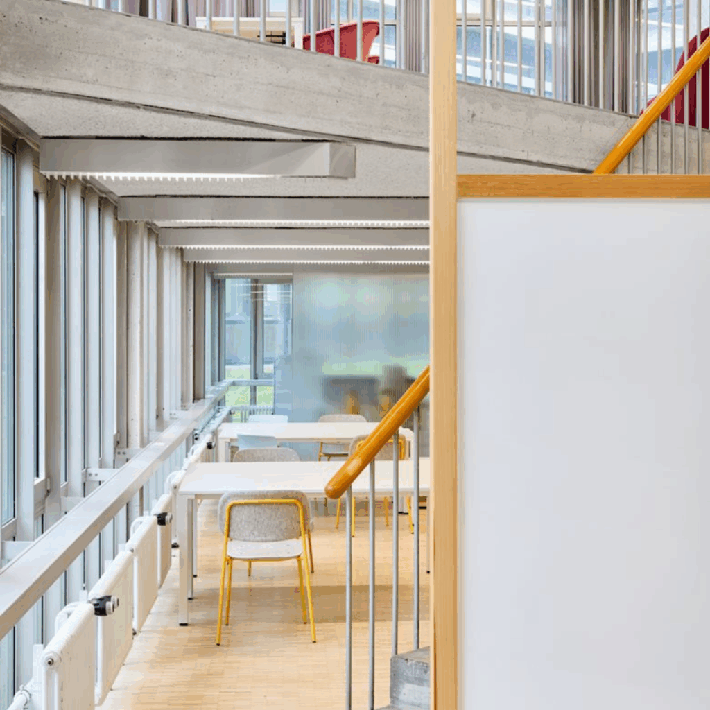 O redesenho se baseia na energia do prédio existente para criar um espaço com uma identidade visual forte que oferece uma estrutura ágil para uma variedade de formatos de trabalho estudantil.