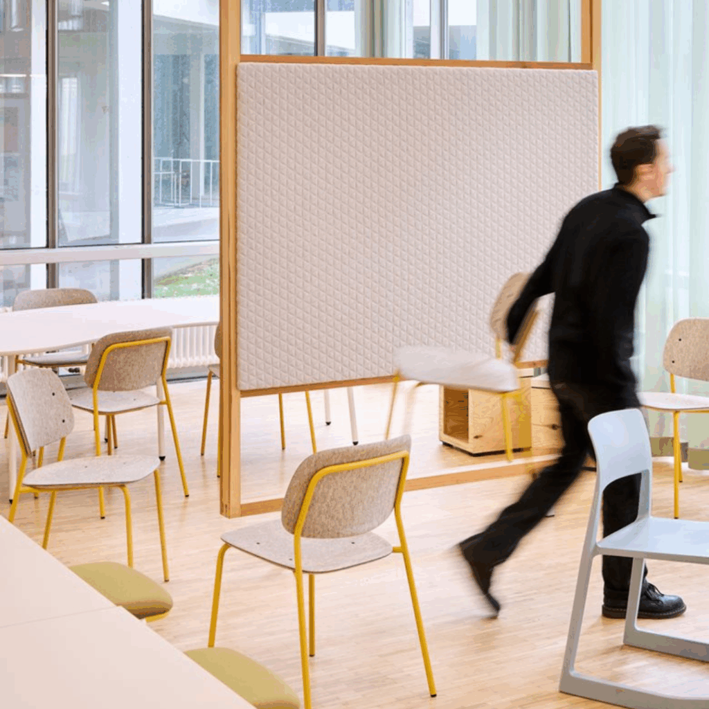 Uma antiga sala de trabalho estudantil em um prédio do final dos anos 1970 no local da universidade em Vaihingen, foi convertida pelo escritório de arquitetura Ippolito Fleitz Group em um ambiente de aprendizado contemporâneo para até 100 estudantes.