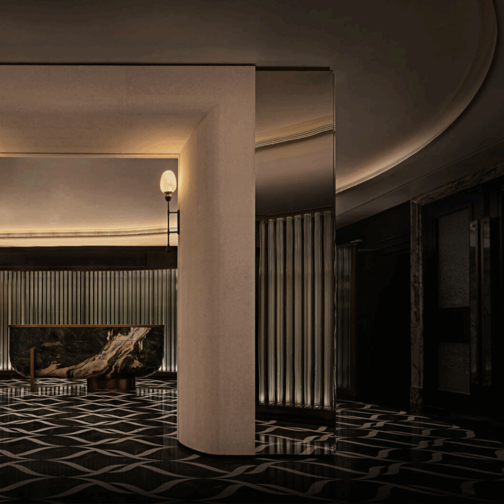 Veios de mármore preto e branco naturais, tecidos de parede bordados e uma estética refinada e elegante cultivam um ambiente privado único, culminando em uma experiência única.