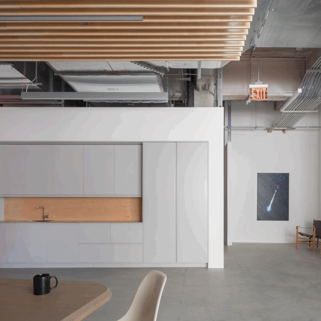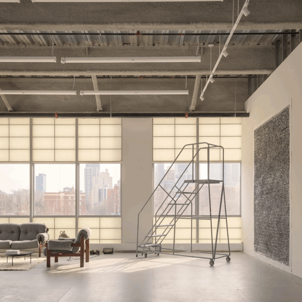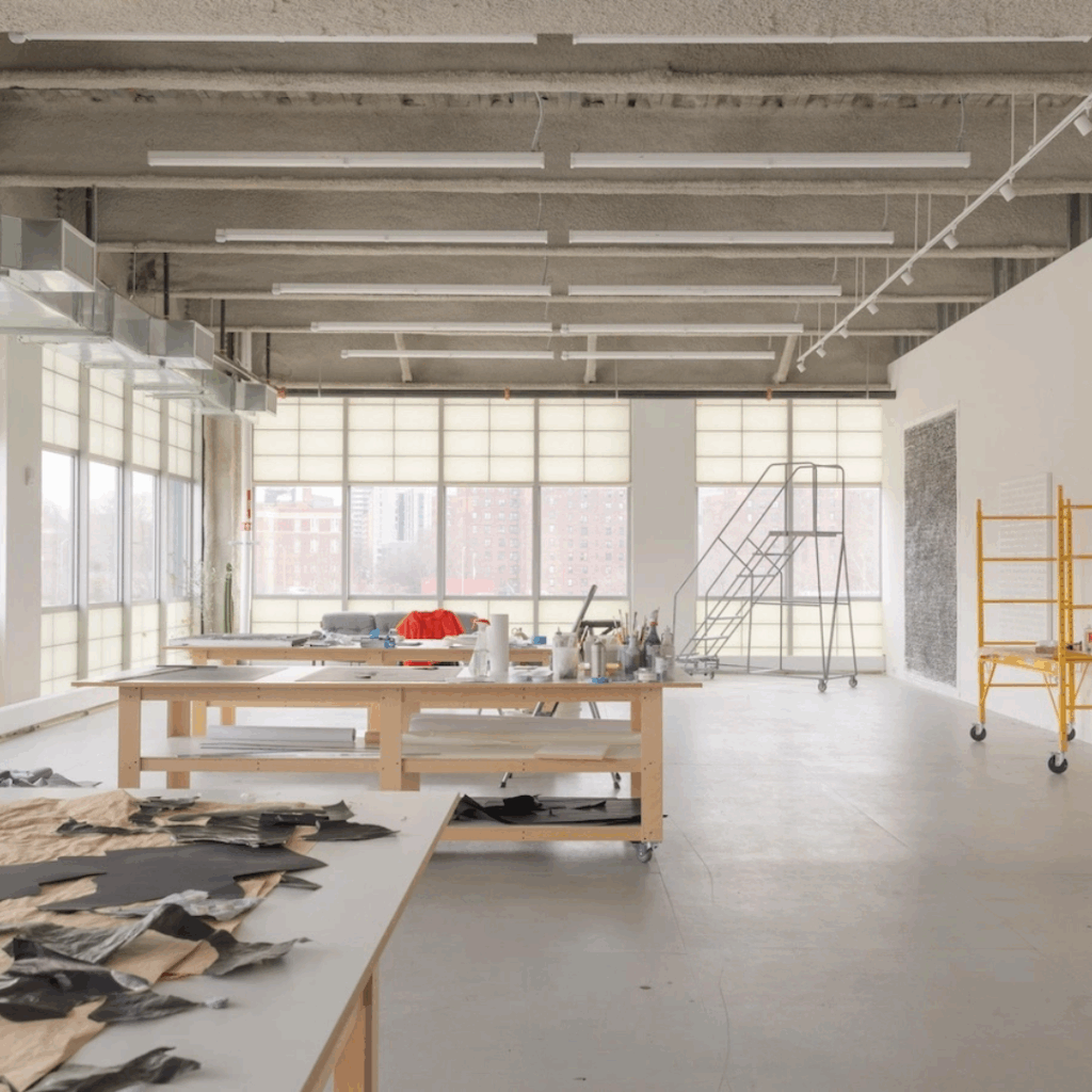 O estúdio foi concebido não como uma caixa branca imaculada, mas como um instrumento, um lugar que pode suportar a escala e a intensidade da prática de Glenn Ligon enquanto amplifica suas ressonâncias materiais.
