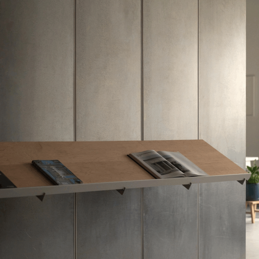 Nas mãos do arquiteto, essa matéria desgastada não se torna um artefato nostálgico, mas sim uma ferramenta para o presente: uma bancada de trabalho, arquivo e sistema de exibição em um.