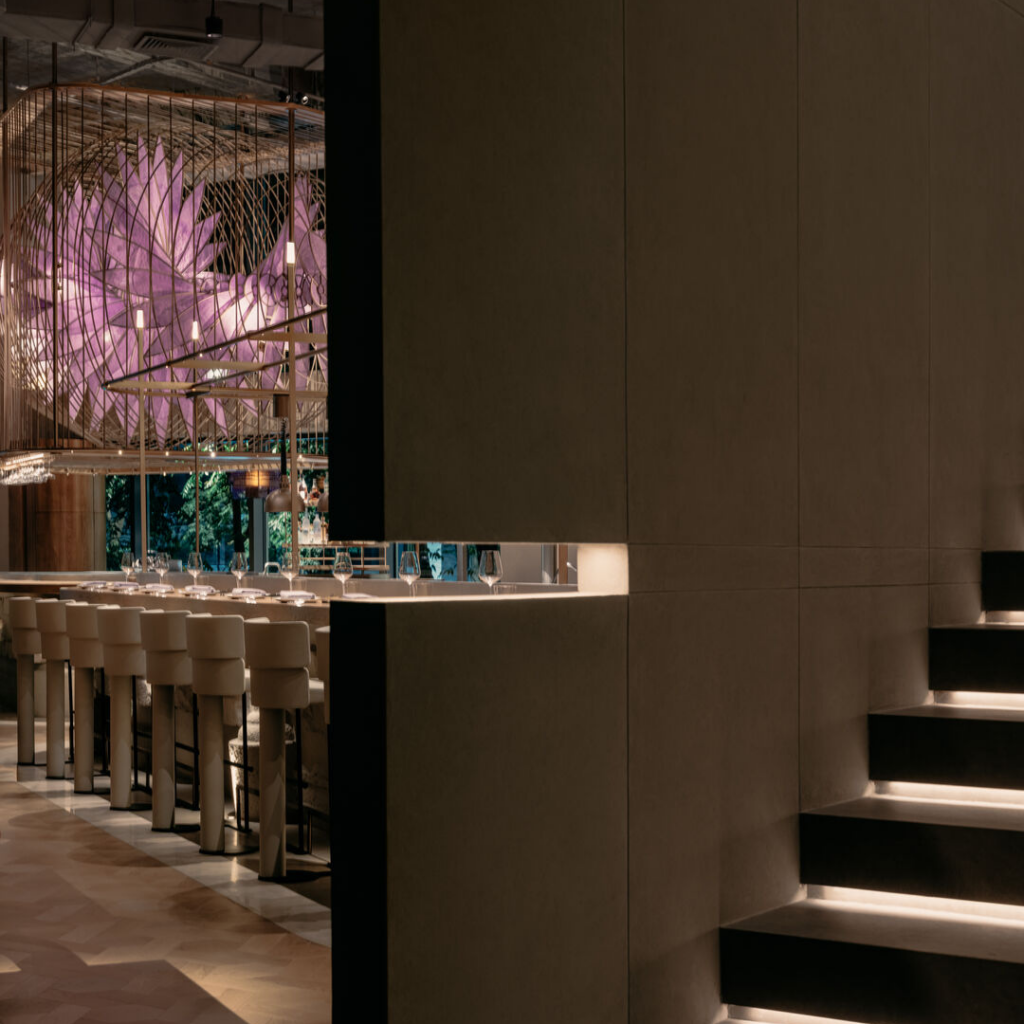 Um dossel espelhado em bronze antigo expande o teto baixo, gravado com motivos florais abstratos que se alinham perfeitamente com a iluminação; um “céu” silencioso e elevado.