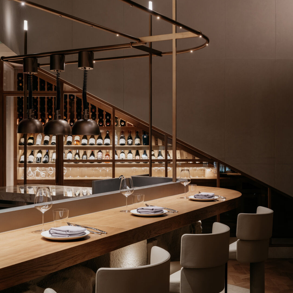 A experiência gastronômica se desenrola em torno de uma cozinha aberta com balcão de chef e um bar central guiado por coquetéis.