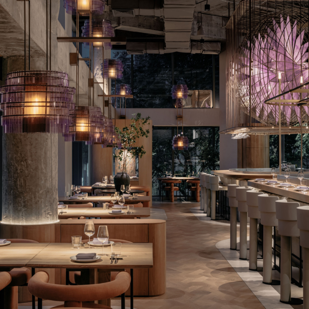A chegada começa no coração da flor: um bar circular ancora o ambiente, combinado com um anel de jantar envolvente na cozinha aberta para formar um palco unificado FOH/BOH.