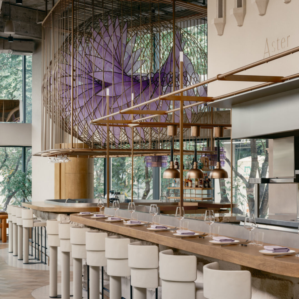 O Aster, Shangai, projeto do RooMoo Design Studio, é um novo destino gastronômico inspirado em seu homônimo, o aster, uma flor cujo nome também significa “estrela”.