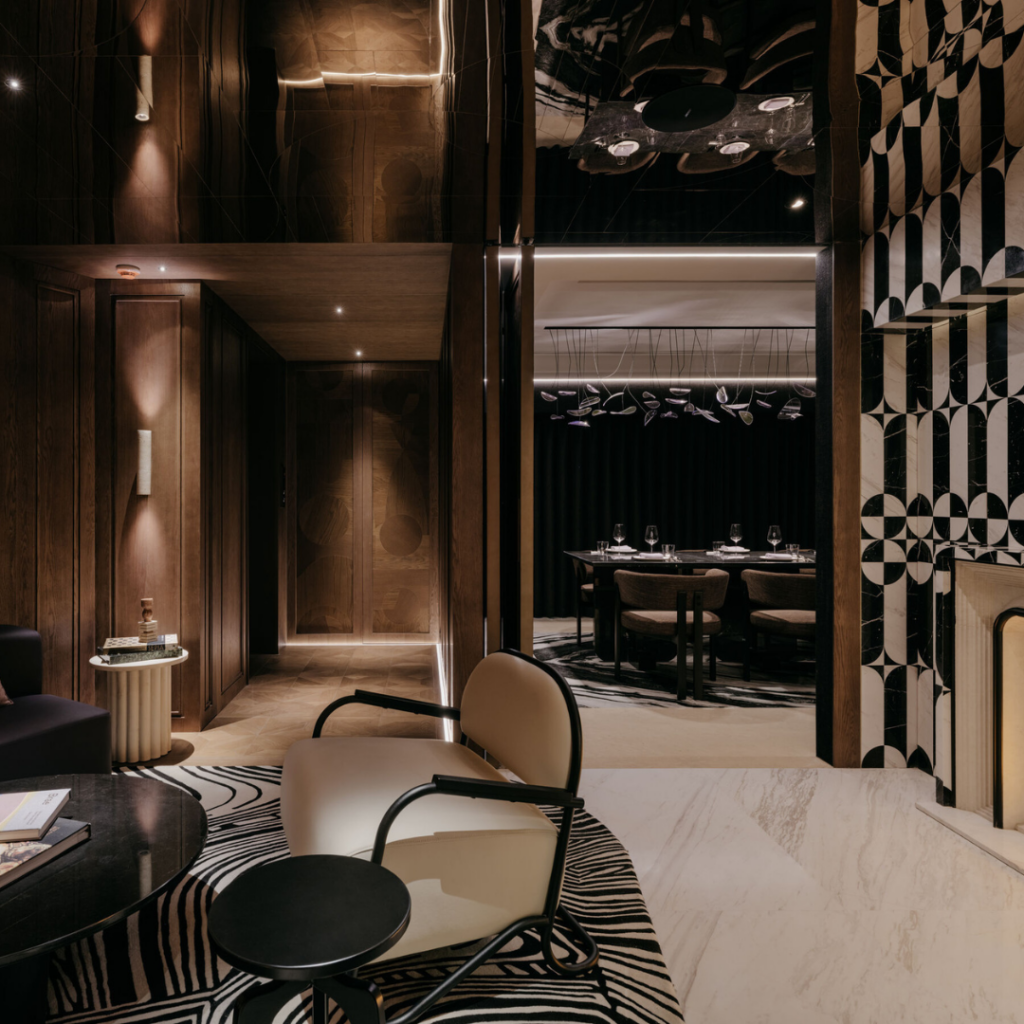 O mezanino se desdobra gradualmente em um lounge de nogueira e veludo, onde a geometria se desloca sutilmente fora do eixo, criando intriga.