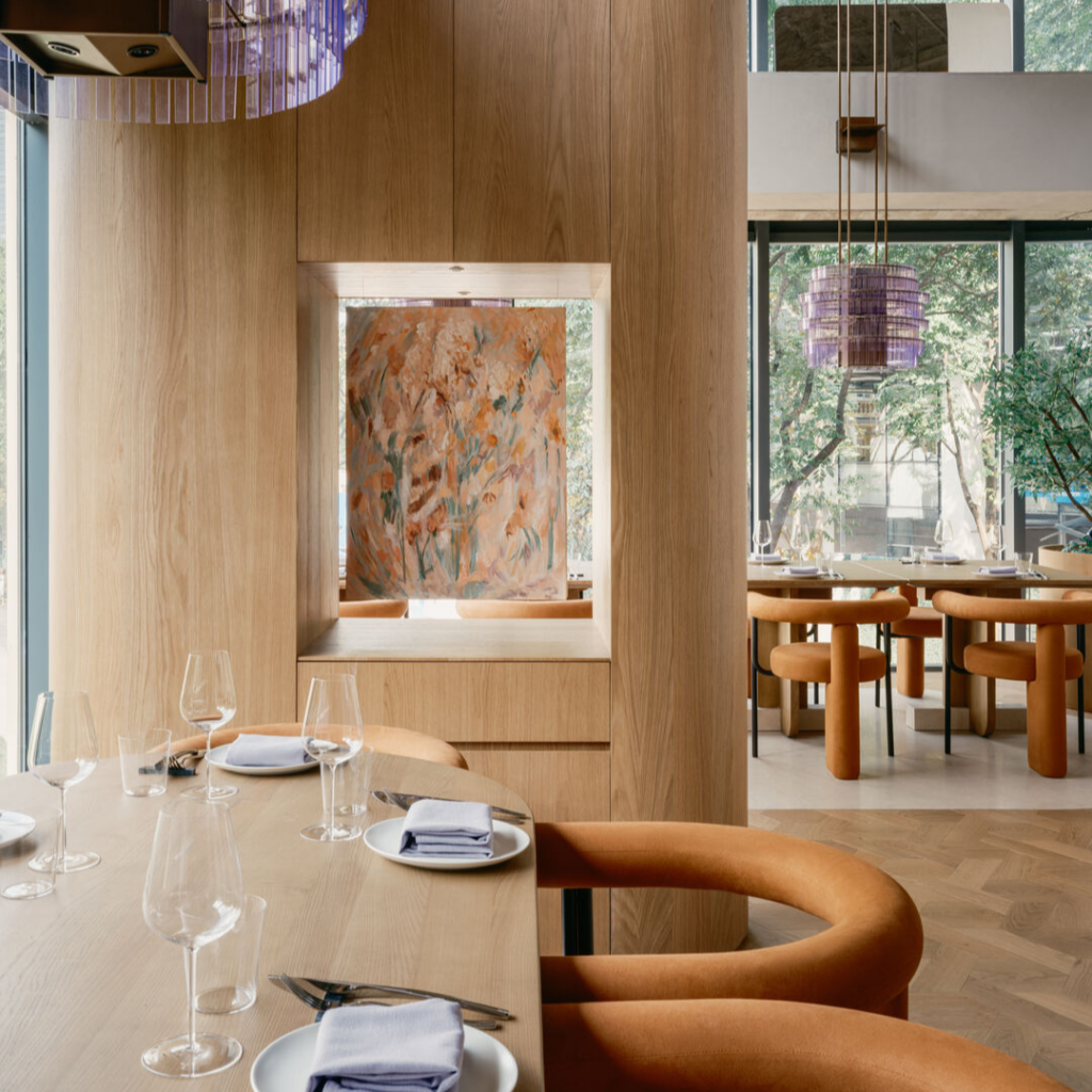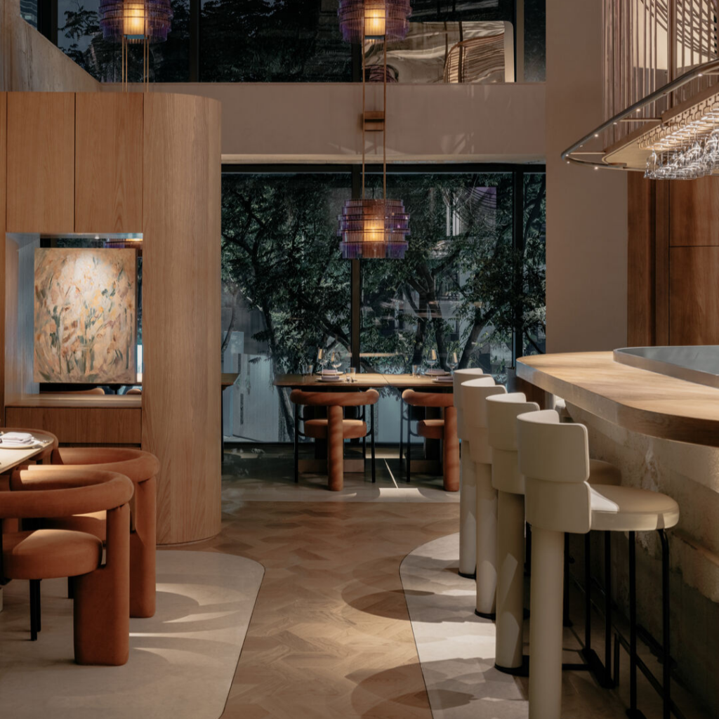 Contra um fundo escuro de têxteis, a atenção retorna à comida, conversa e intimidade. Pedra e madeira dão lugar ao veludo e ao tecido, garantindo que cada toque seja suave, quente e convidativo.