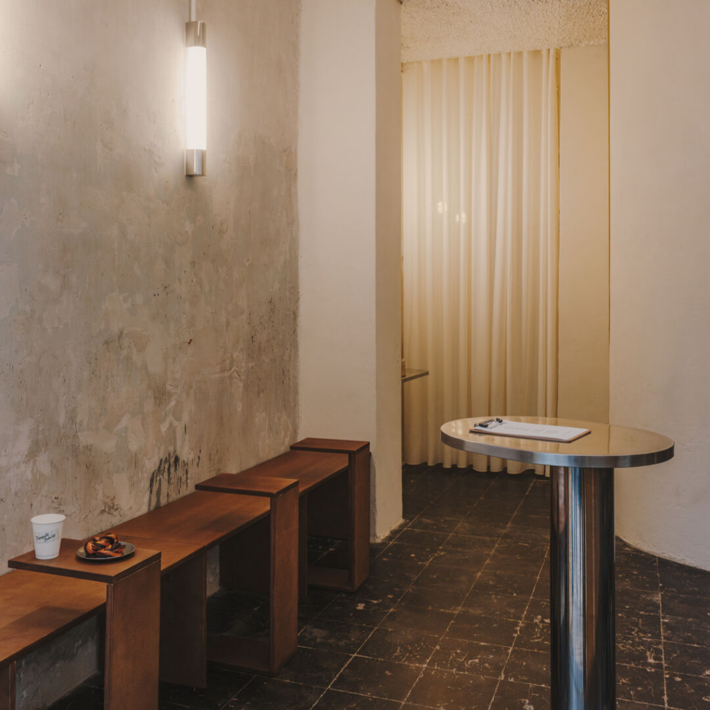 Com uma área total de apenas 26m2, o projeto se baseia em uma premissa clara: funcionar como um espelho, uma simetria perfeita que articula o diálogo entre a padaria e a área de delivery.