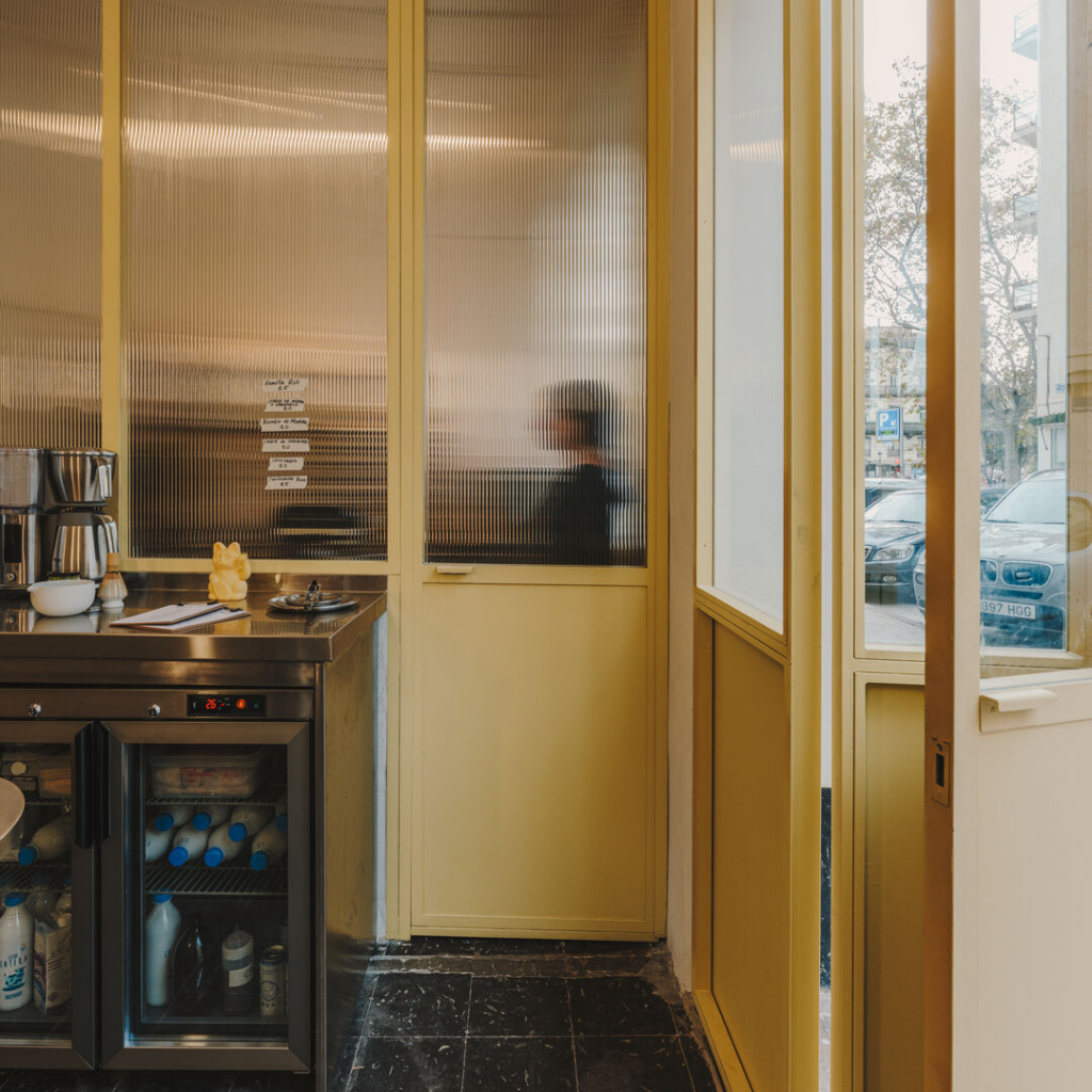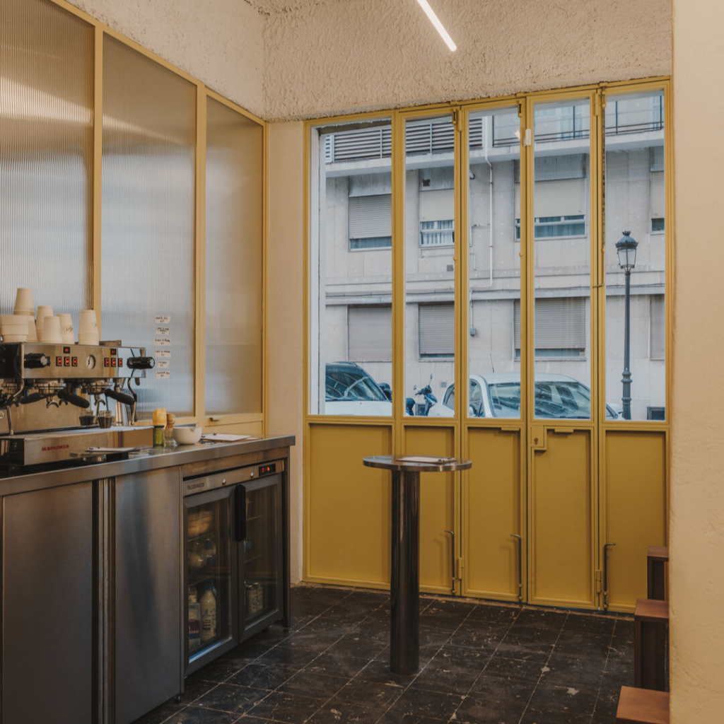 A cor é o centro do palco no trabalho de ferro das portas, tingido de amarelo pastel que evoca a manteiga usada nos doces da padaria.
