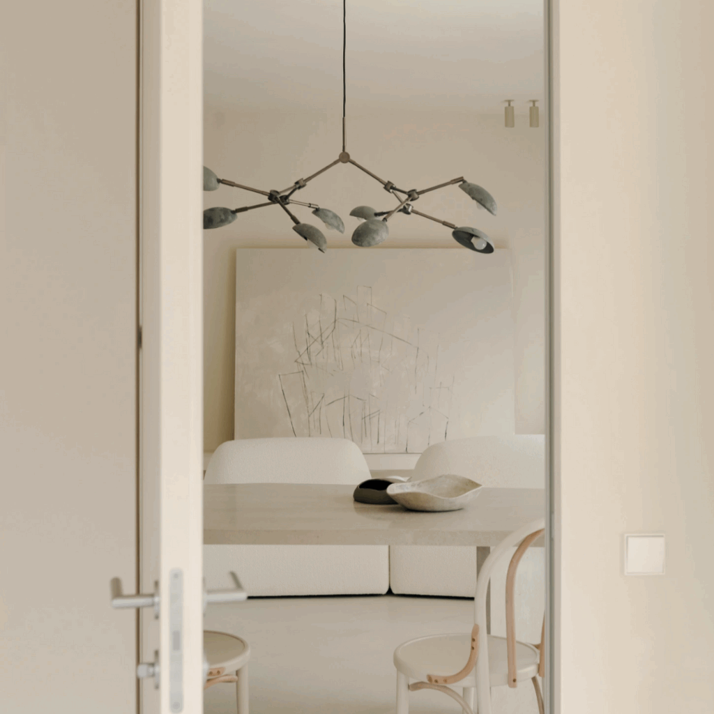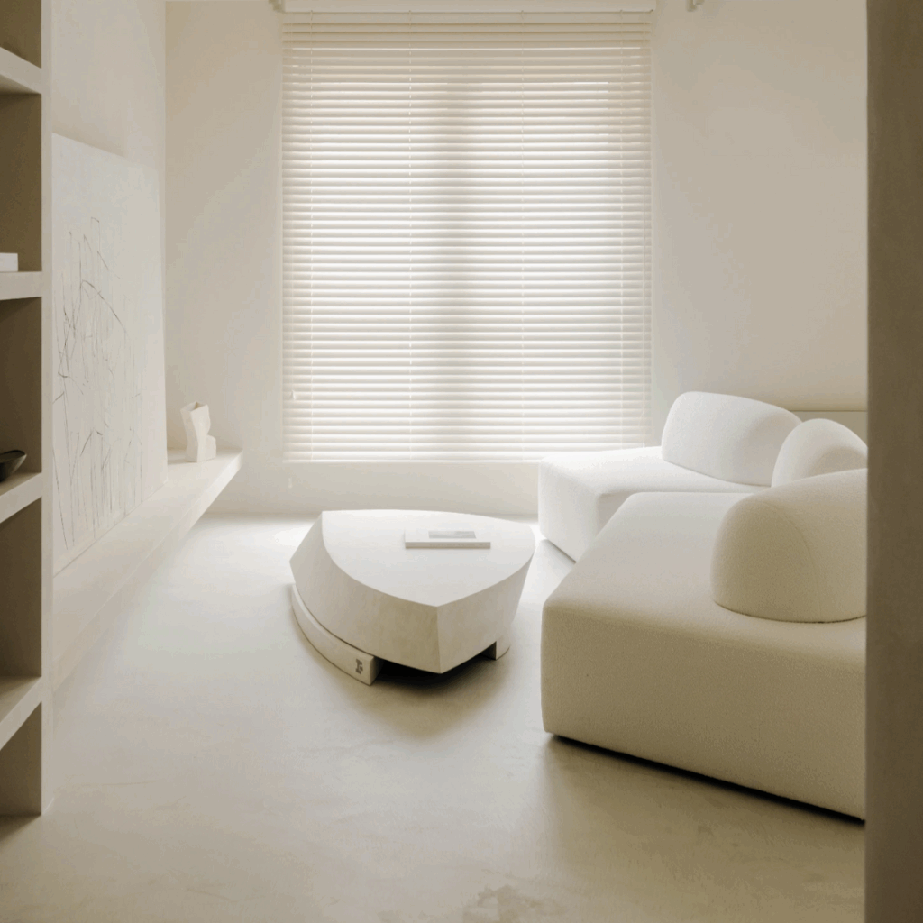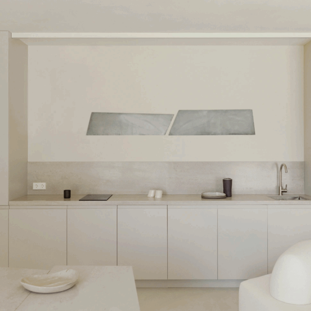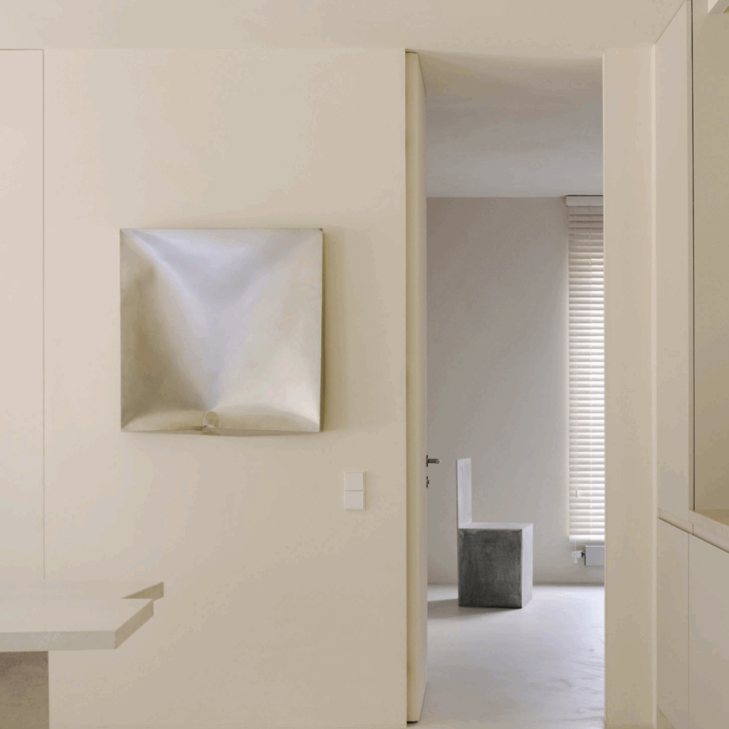 Em vez de impor floreios decorativos, o arquiteto trabalhou com a ausência, fundindo a loggia com a área de estar principal, dissolvendo o armazenamento nas paredes e reduzindo a paleta a brancos quentes e cinzas suaves.