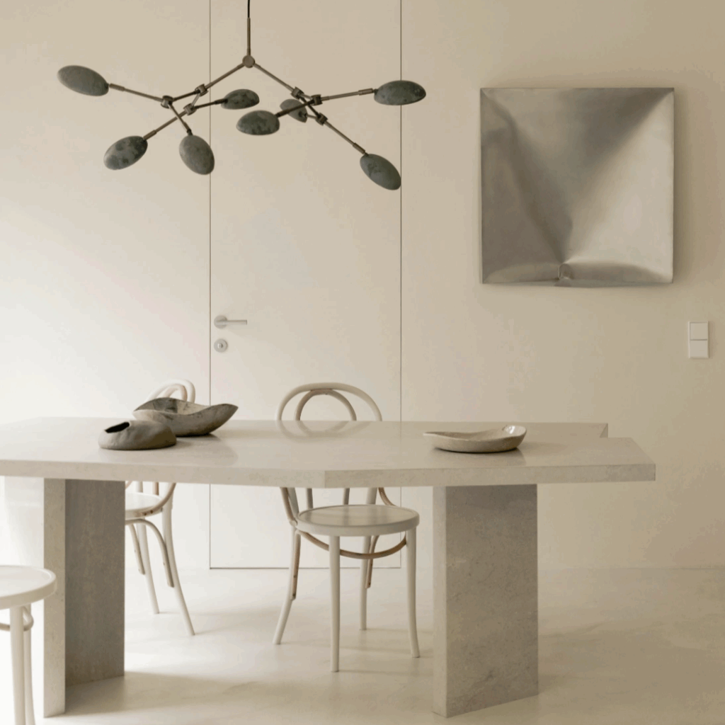 Ao excluir o preto e restringir os acabamentos a superfícies foscas, o arquiteto criou uma luz que parece quase tátil.