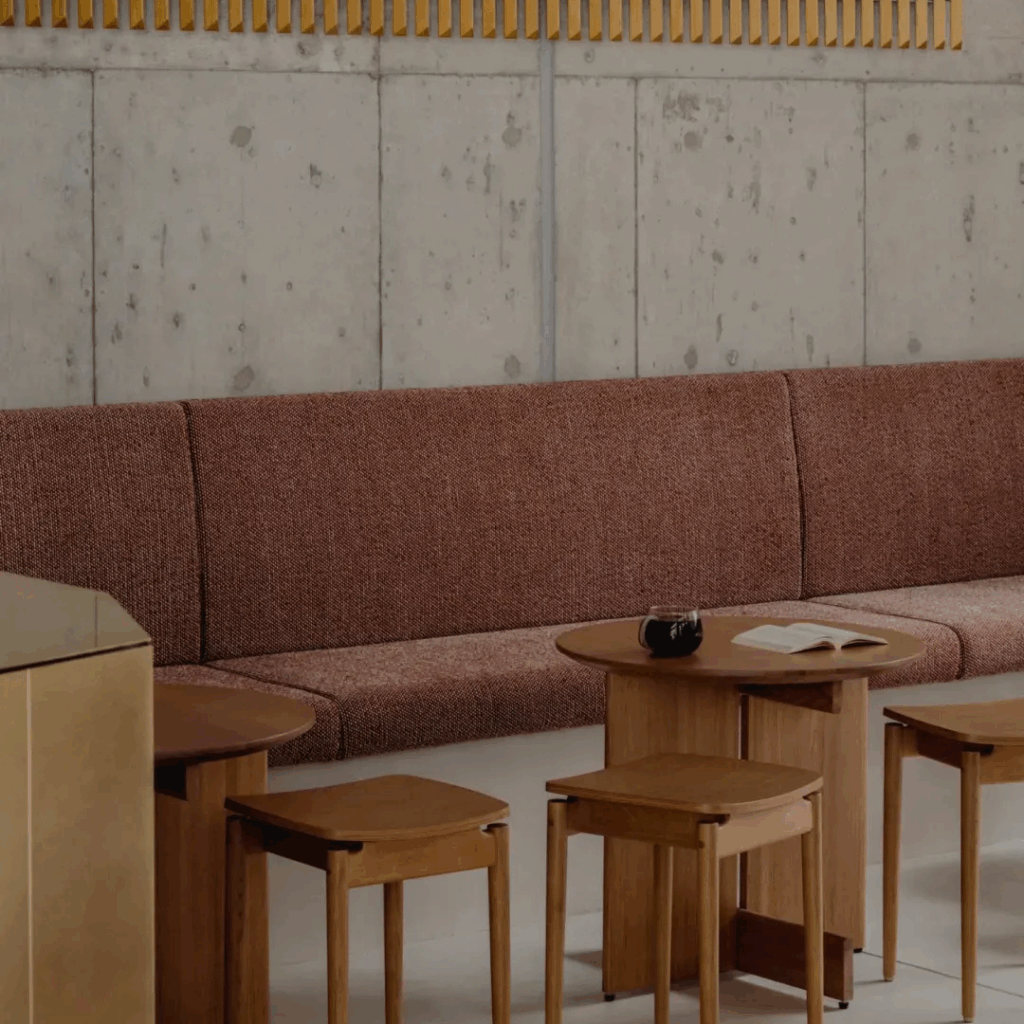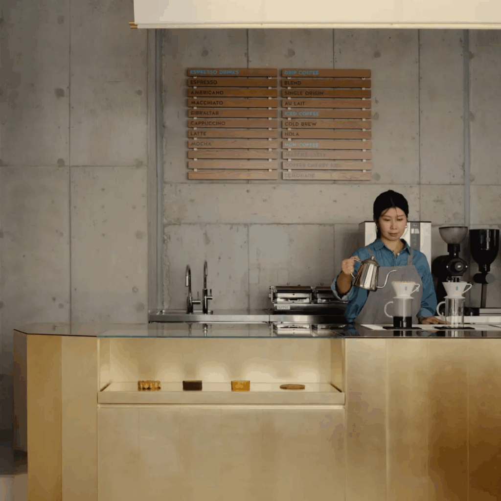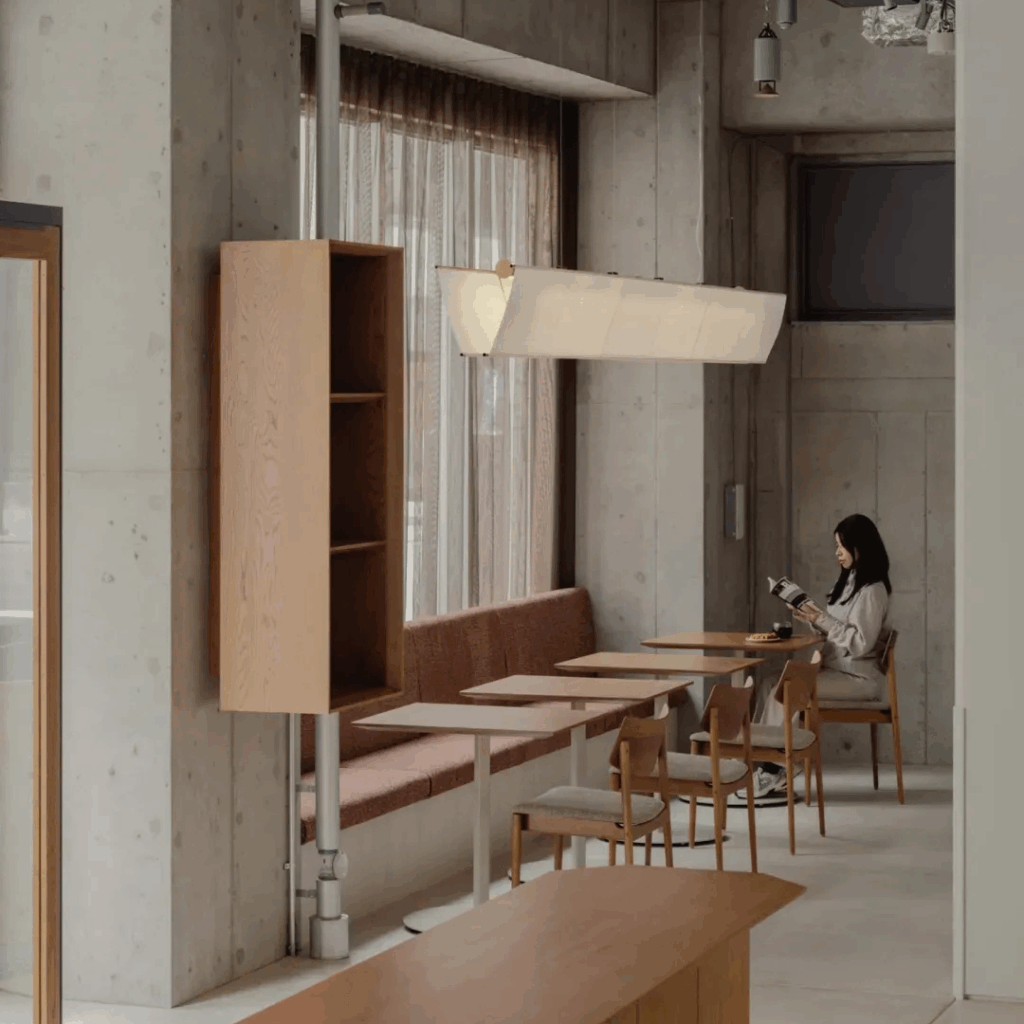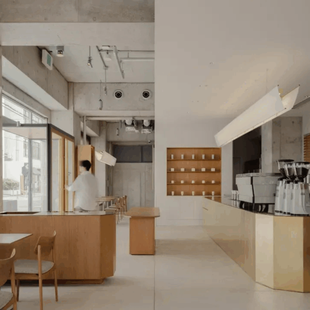 O café destila uma sensibilidade japonesa contemporânea, uma que resiste ao simbolismo explícito em favor da nuance espacial e da clareza material.