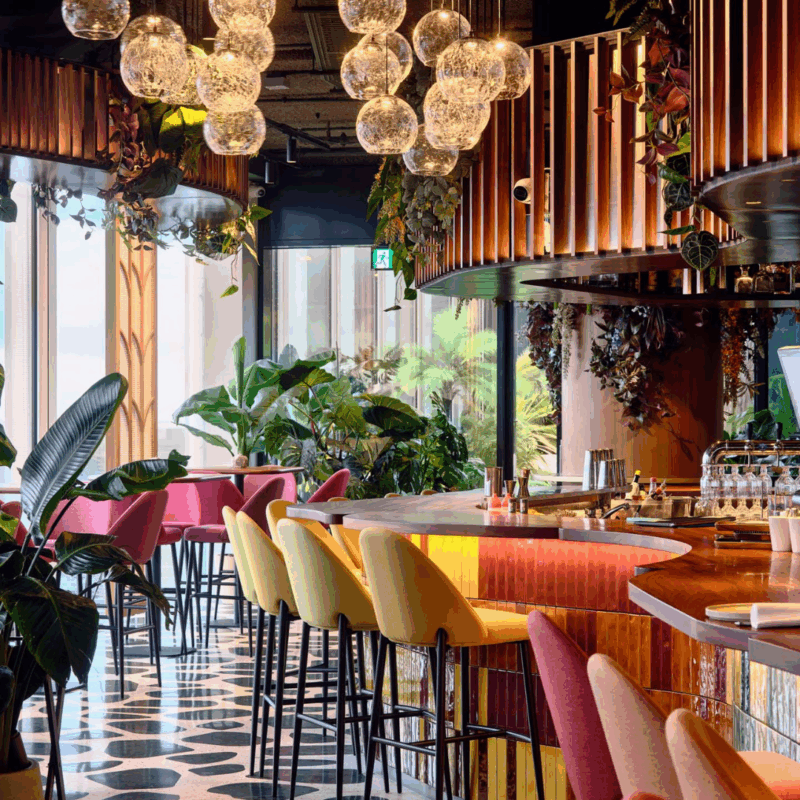 O resultado é flexível, permitindo que o espaço vá de um movimentado café diurno para um espaço de eventos privado cheio de plantas para aluguel.