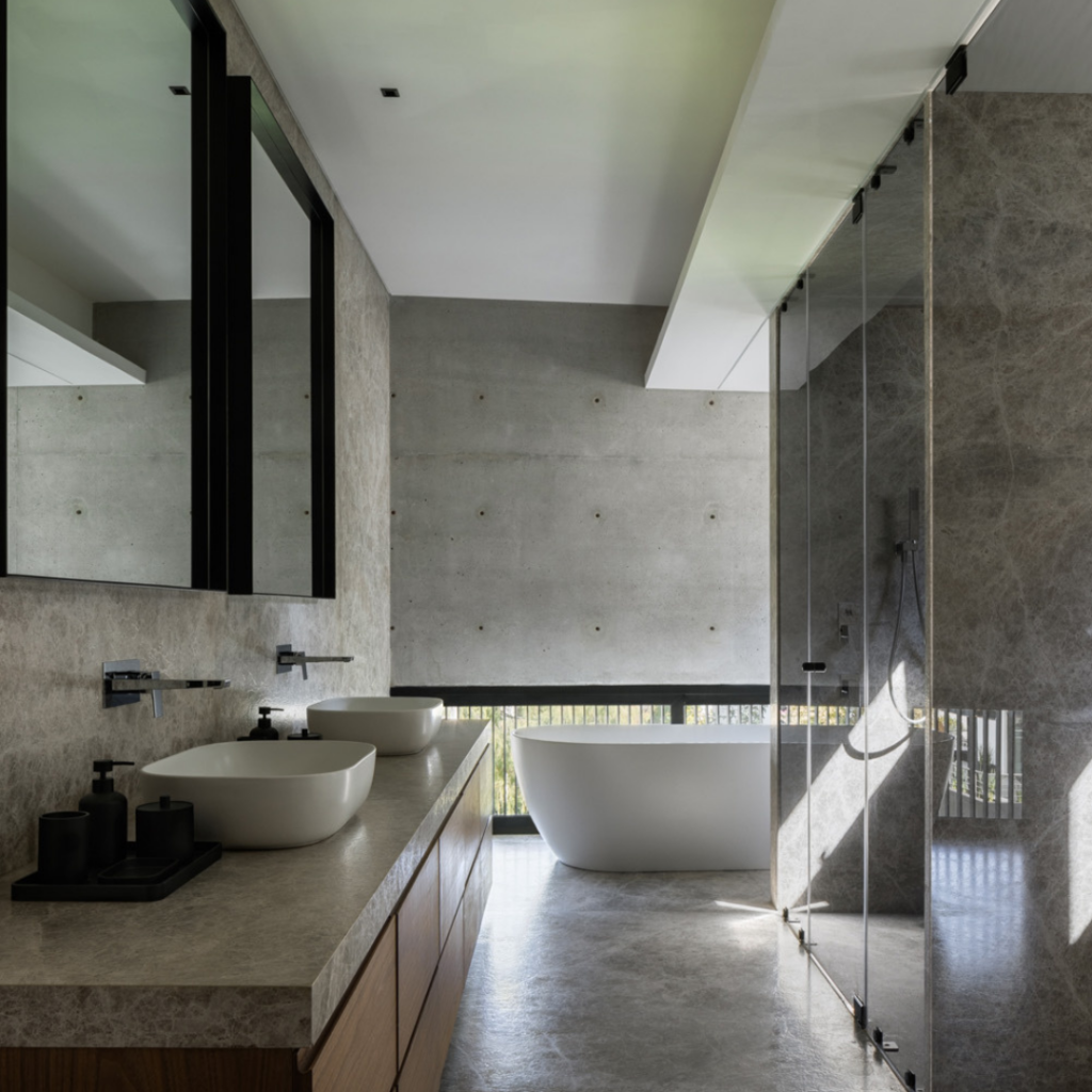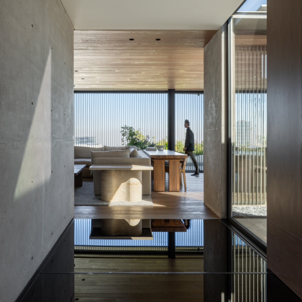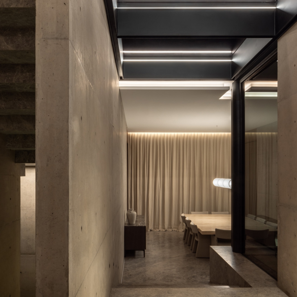 Um corredor que conecta a entrada ao jardim é um dos elementos favoritos do arquiteto, ele explica: “A partir desse espaço, as áreas sociais são organizadas, a luz natural penetra profundamente no interior, e estabelece-se um diálogo constante entre a estrutura construída e a abertura para vistas da natureza”.
