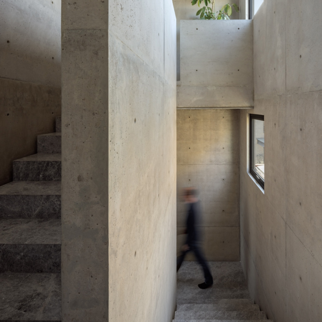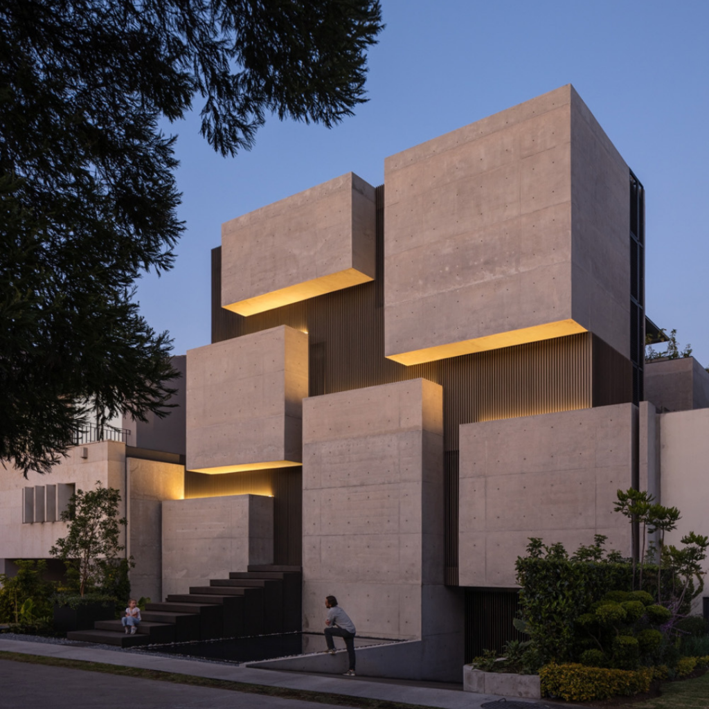 A casa cubista, toda em volumes de concreto e fachadas brutalistas, está situada em Cumbres de Santa Fé, um bairro residencial na Cidade do México.