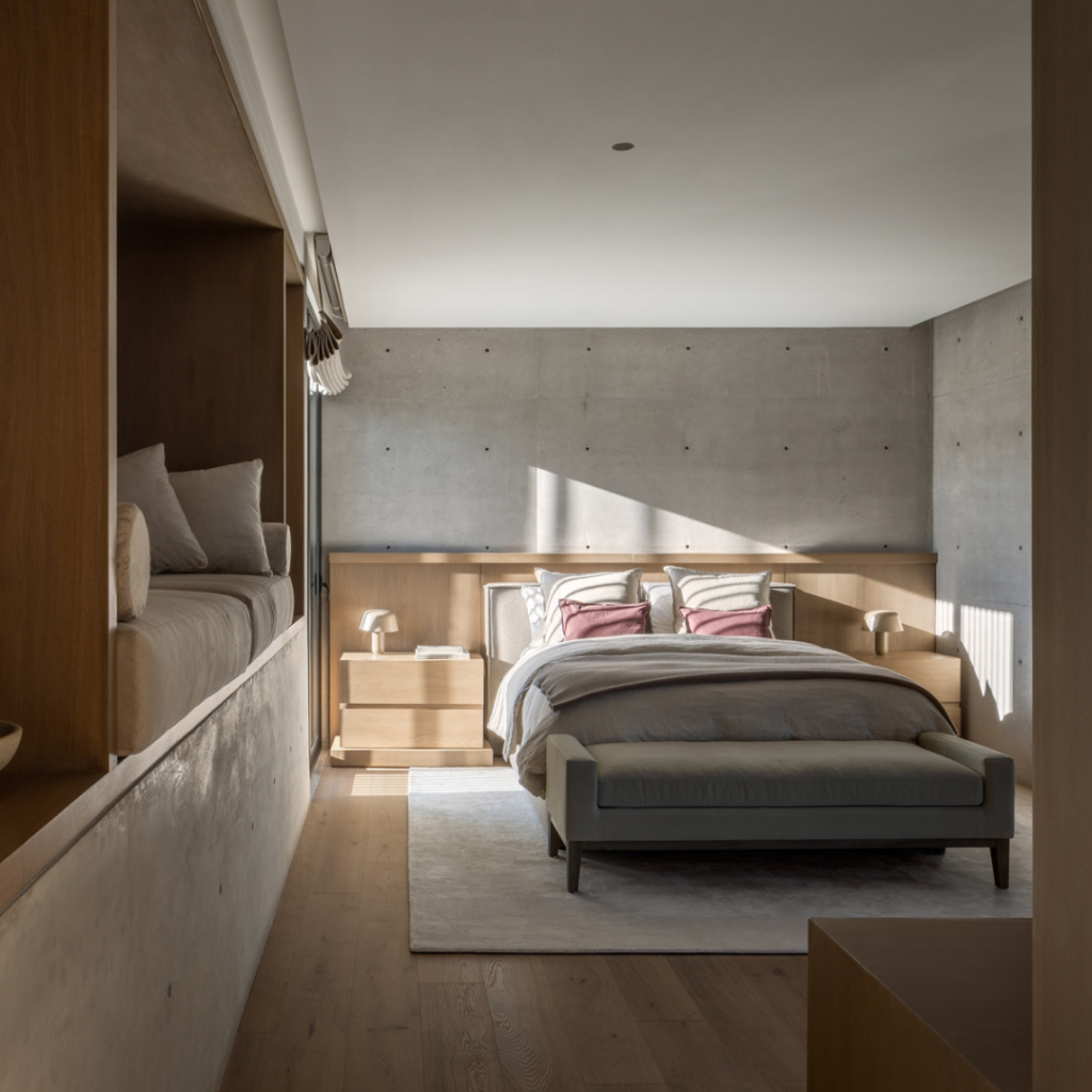 No nível superior, o quarto principal é composto por vigas de concreto nas paredes que remetem à materialidade do edifício.