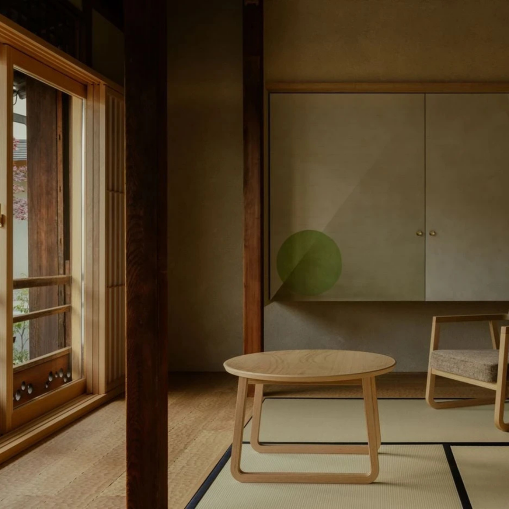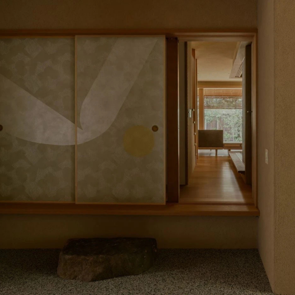 Painéis deslizantes fusuma com composições geométricas abstratas do Noda Print Studio, aclamado pelo uso moderno de técnicas de impressão manual em karakami, conferem ao espaço um ritmo gráfico suave.