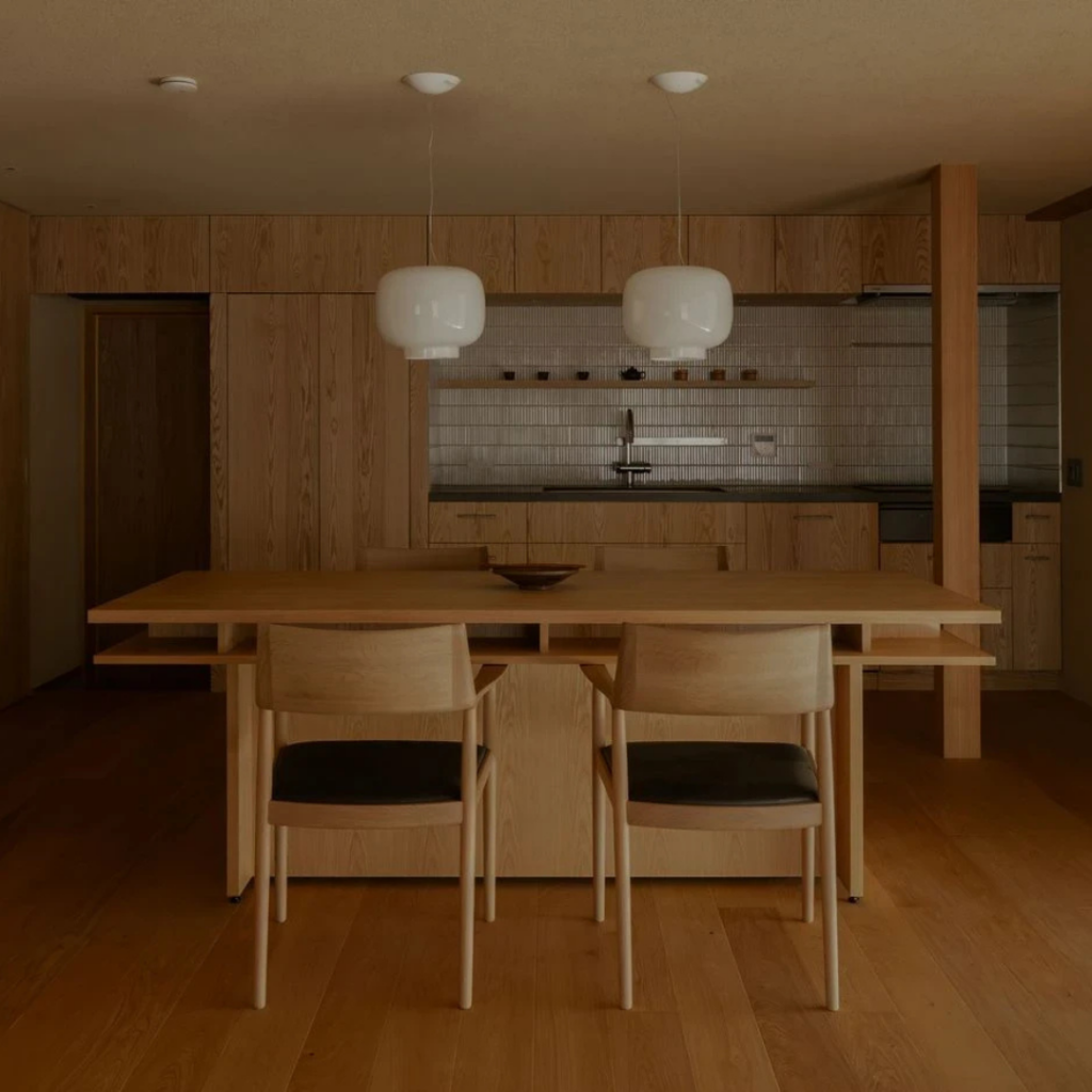 O reboco Juraku confere às paredes e tetos uma profundidade aveludada, suavizando a iluminação, enquanto pisos de madeira, postes e vigas de madeira e móveis de madeira em veio natural adicionam mudanças tonais acolhedoras.