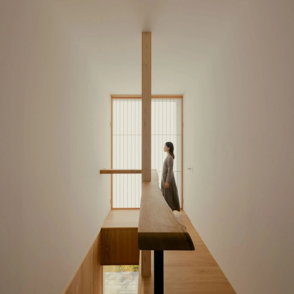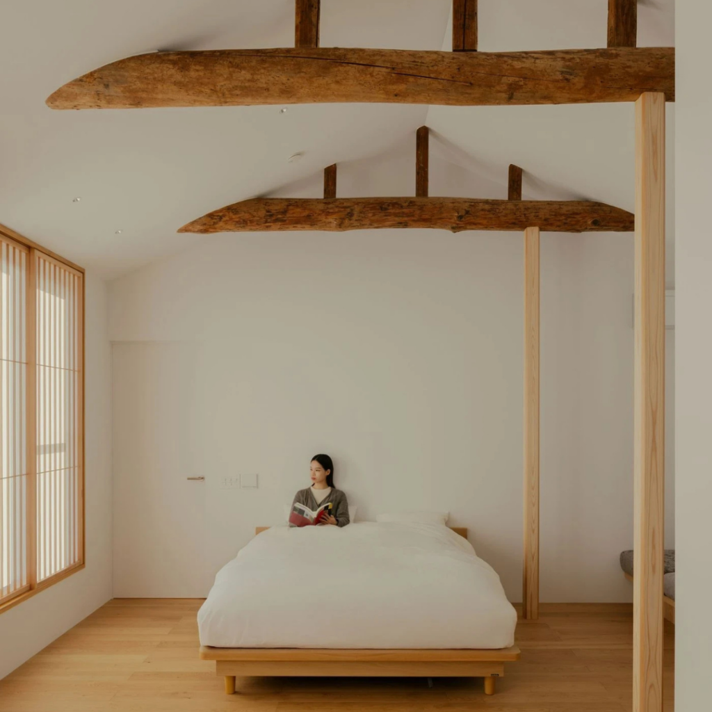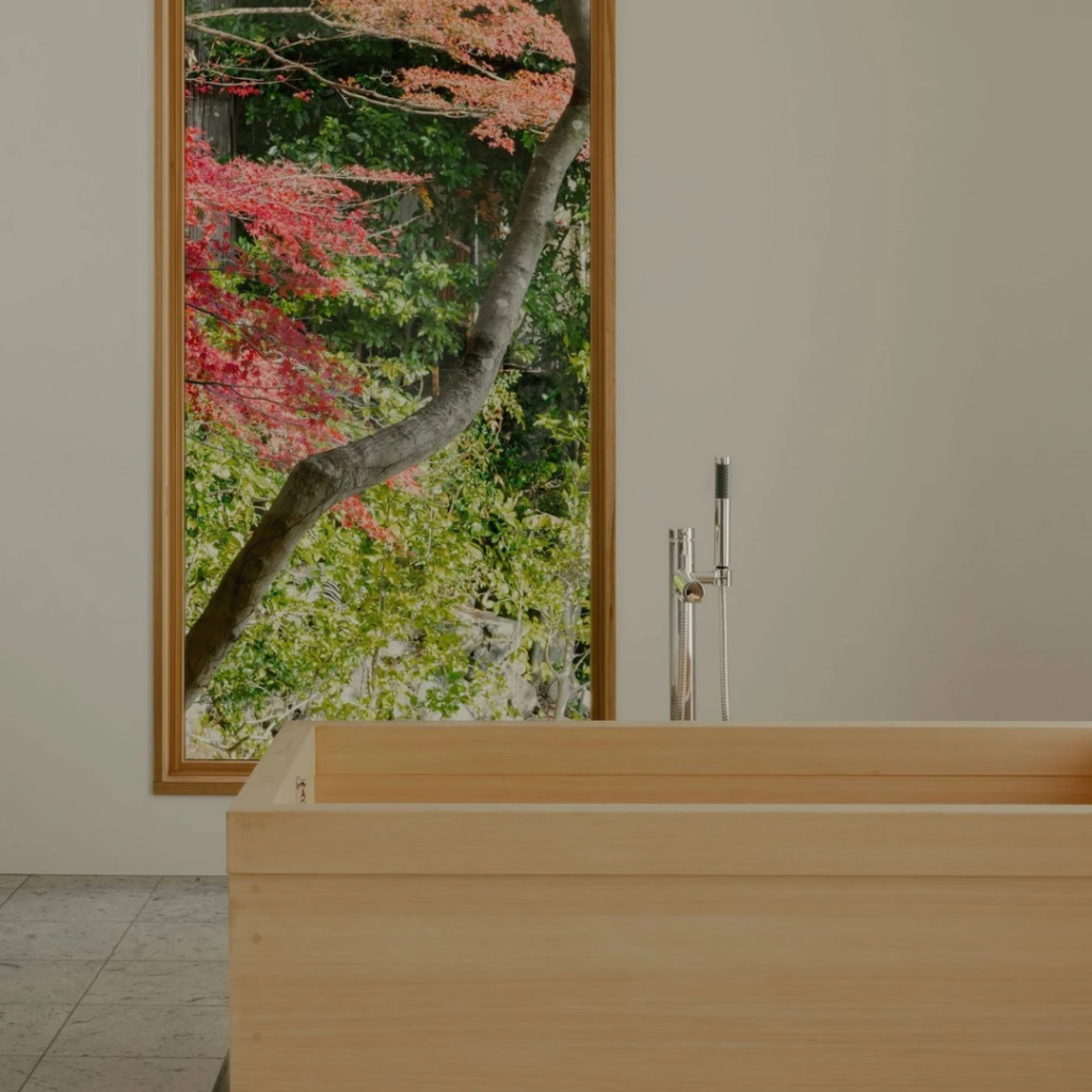 Em uma suíte no andar de cima, um banho hinoki se conecta perfeitamente ao quarto, transformando o banho em um ato contemplativo orientado para a luz filtrada e a mudança sazonal.
