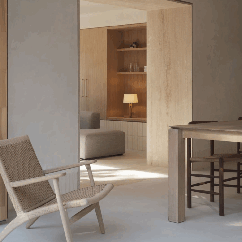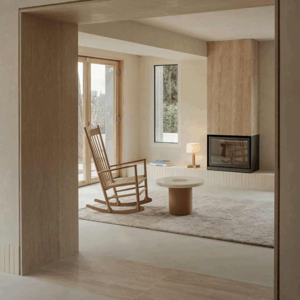 Sua honestidade rude contrasta com a textura suave do carvalho e a elegância discreta do travertino, oferecendo um contraponto tátil que fixa a casa em seu devido lugar.
