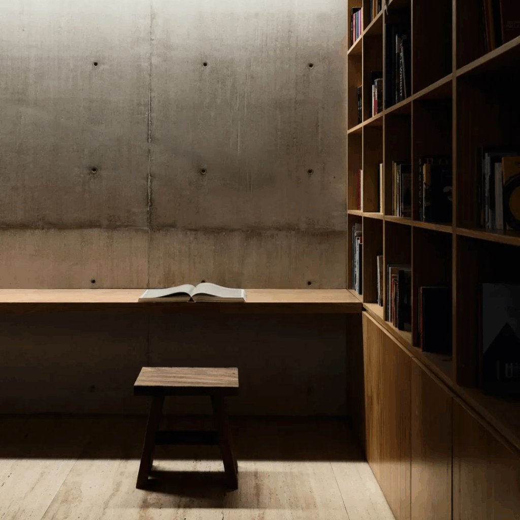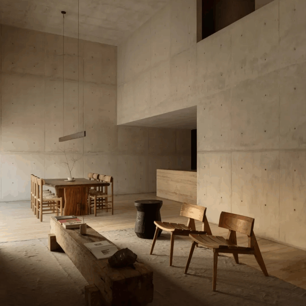 A massa do concreto ancora a inércia térmica, enquanto sua superfície fosca captura o claro-escuro da mudança da luz do dia.