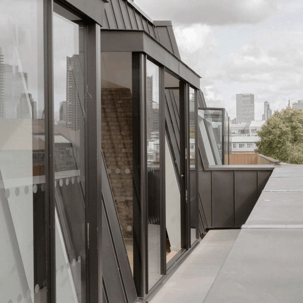 Um andar adicional recuado na cobertura é acabado em zinco com grandes águas-furtadas de vidro estrutural.