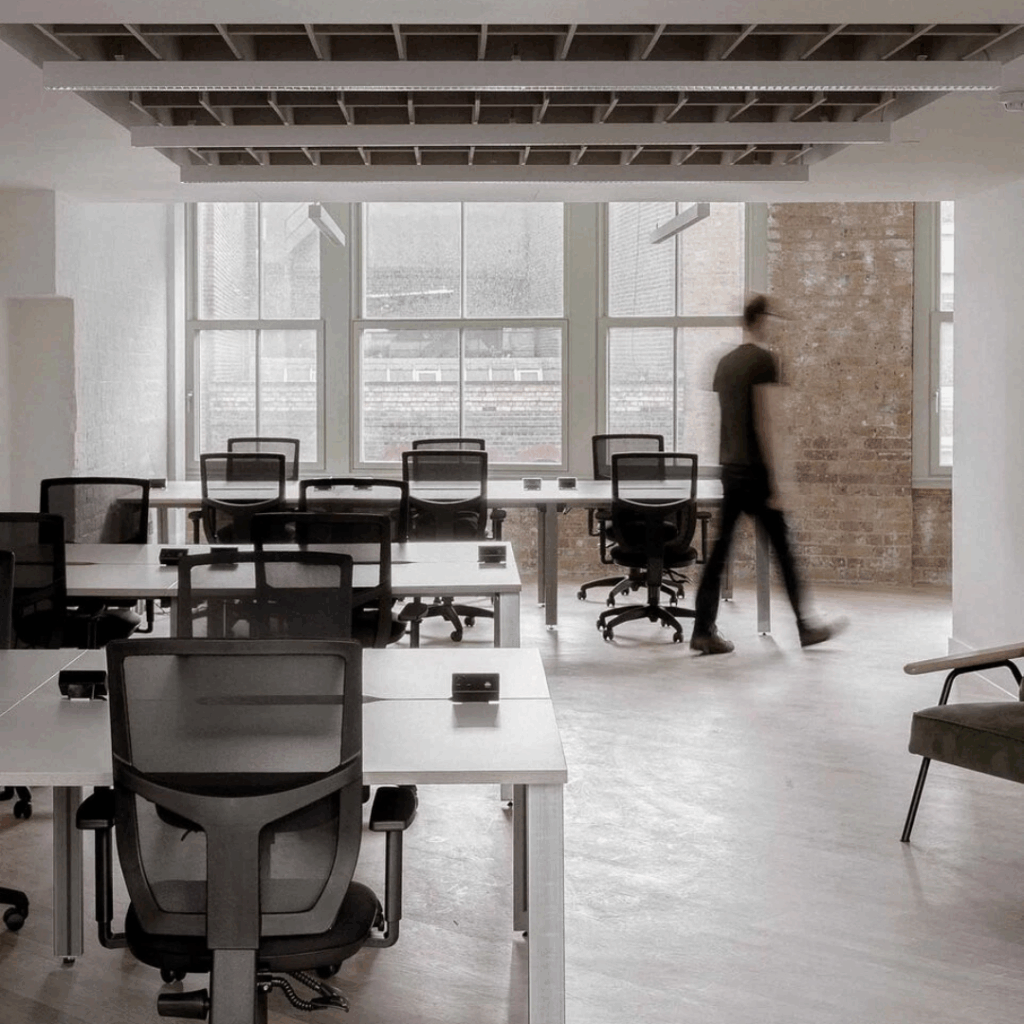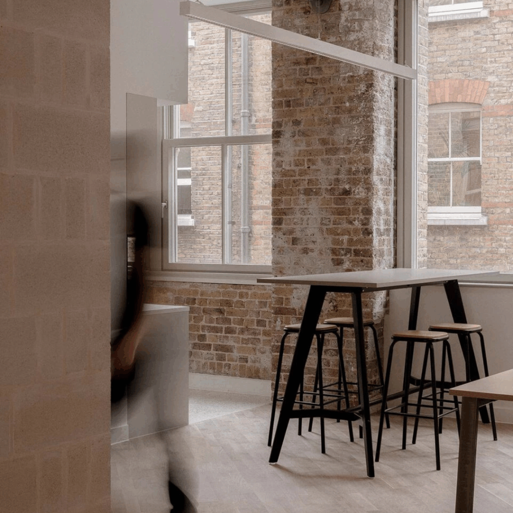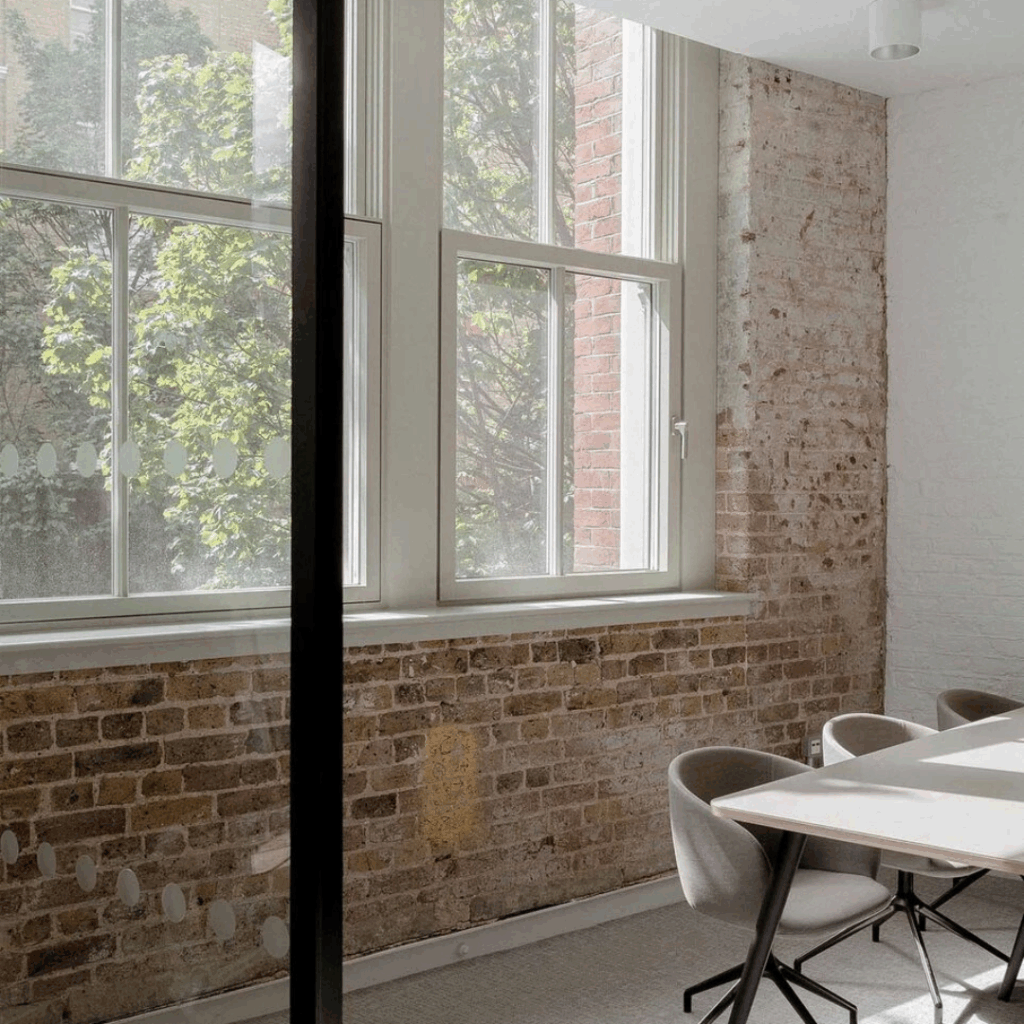 A propriedade agora oferece seis espaços de trabalho para os andares superiores e um showroom de móveis nos níveis térreo e subterrâneo.