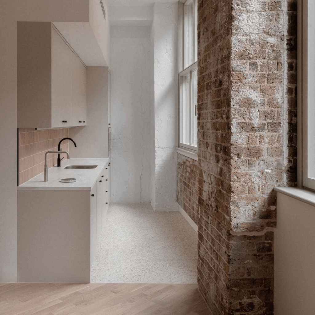 Caixilhos grandes e janelas de clerestório lavam superfícies recém-reveladas e desgastadas pelo tempo com luz natural.