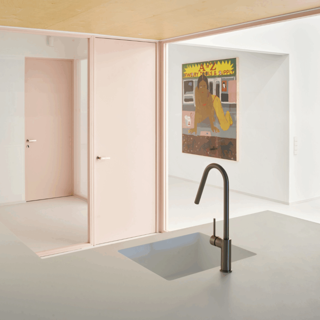 As áreas mais práticas, íntimas ou utilitárias, como cozinha, banheiro e depósito – estão perfeitamente ligadas ao espaço expositivo por divisórias quadradas de vidro emolduradas em rosa, repetidas em todo o layout.
