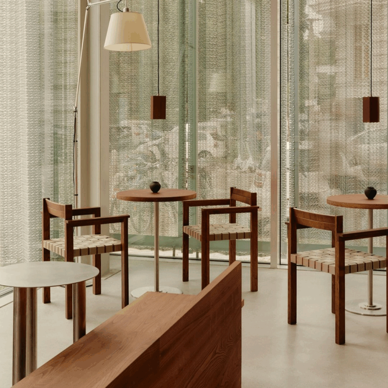 Uma série de aberturas em arco ecoa nos azulejos ovais que lembram as manicures clássicas que revestem as paredes do café.