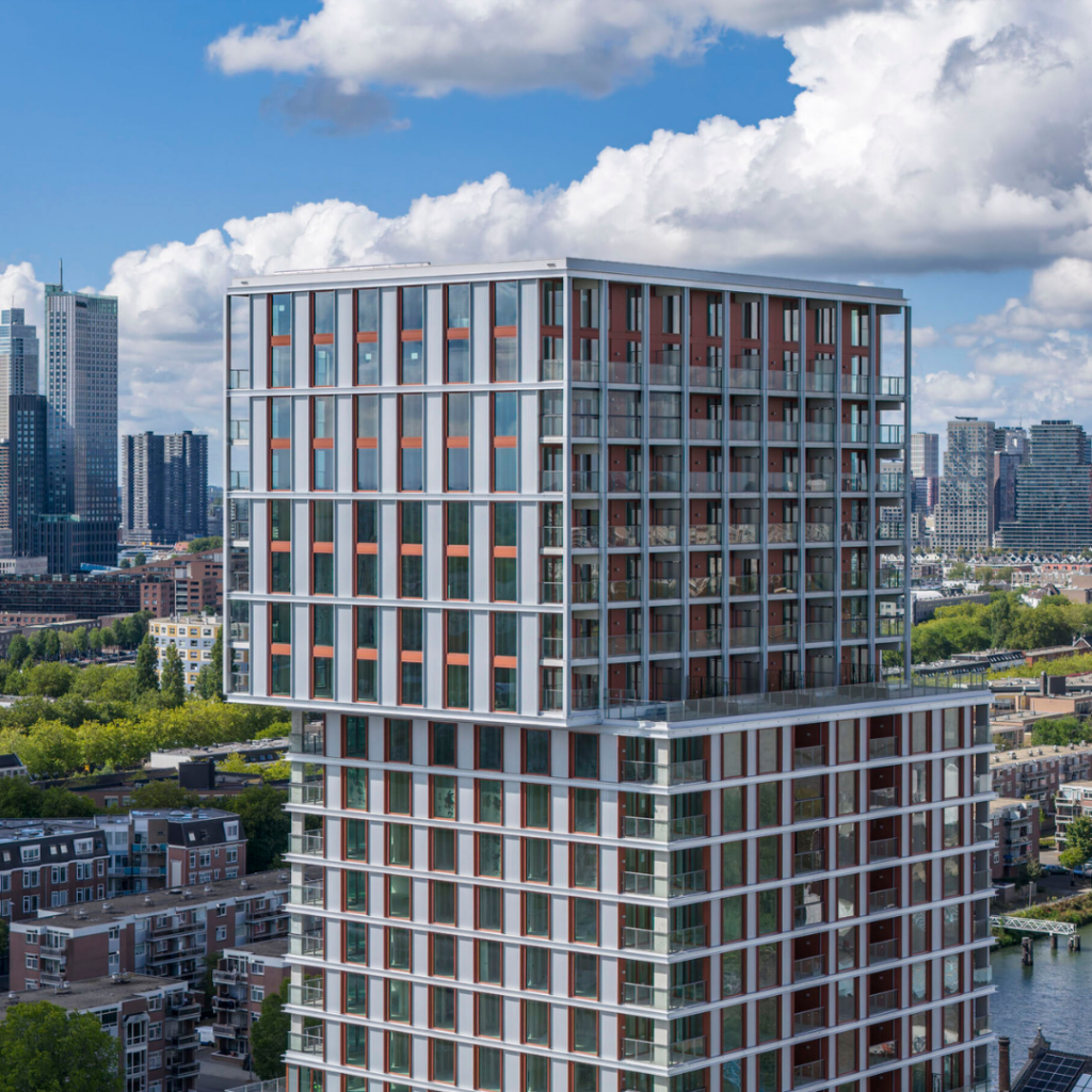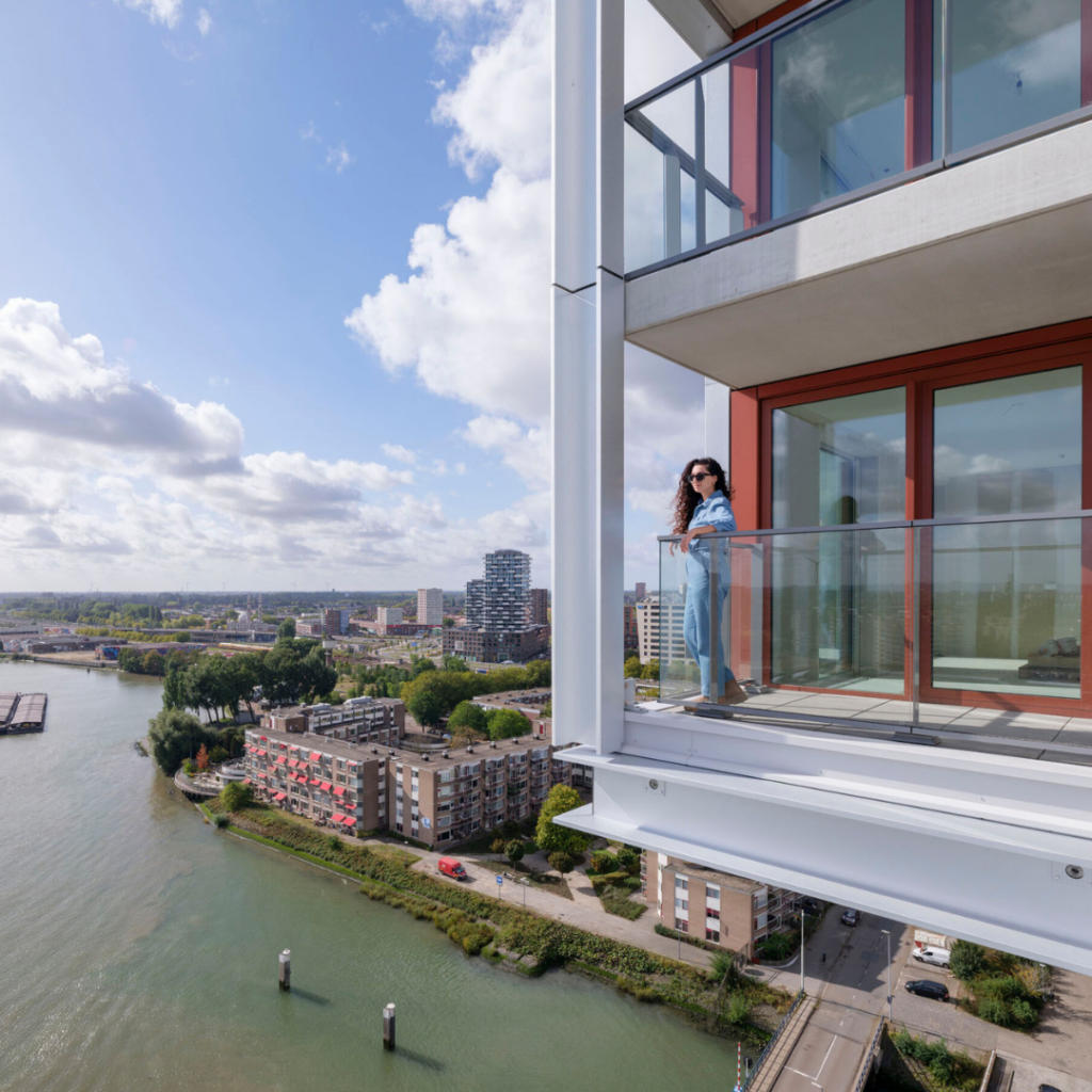 A torre oferece tipologias habitacionais diversas (57-232 m²) com amplos espaços externos e tetos altos, incluindo Waterlofts com cais de ancoragem privativos, Drive-in Lofts com elevadores para carros, Panoramic Lofts com vista para o rio e Skylofts de dupla altura com vista para o horizonte de Roterdã.